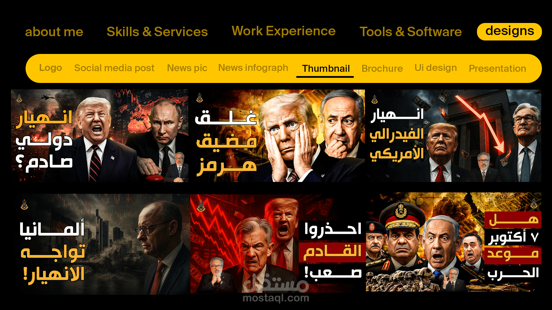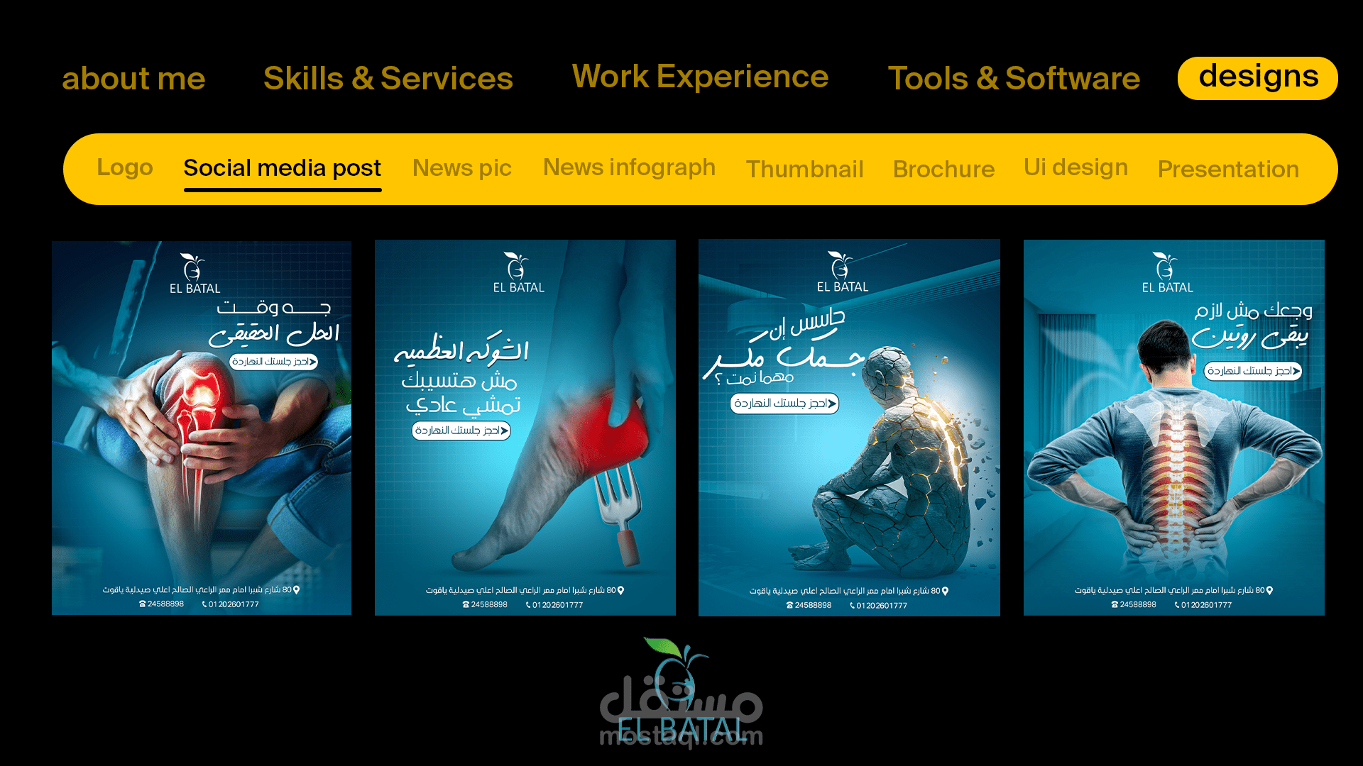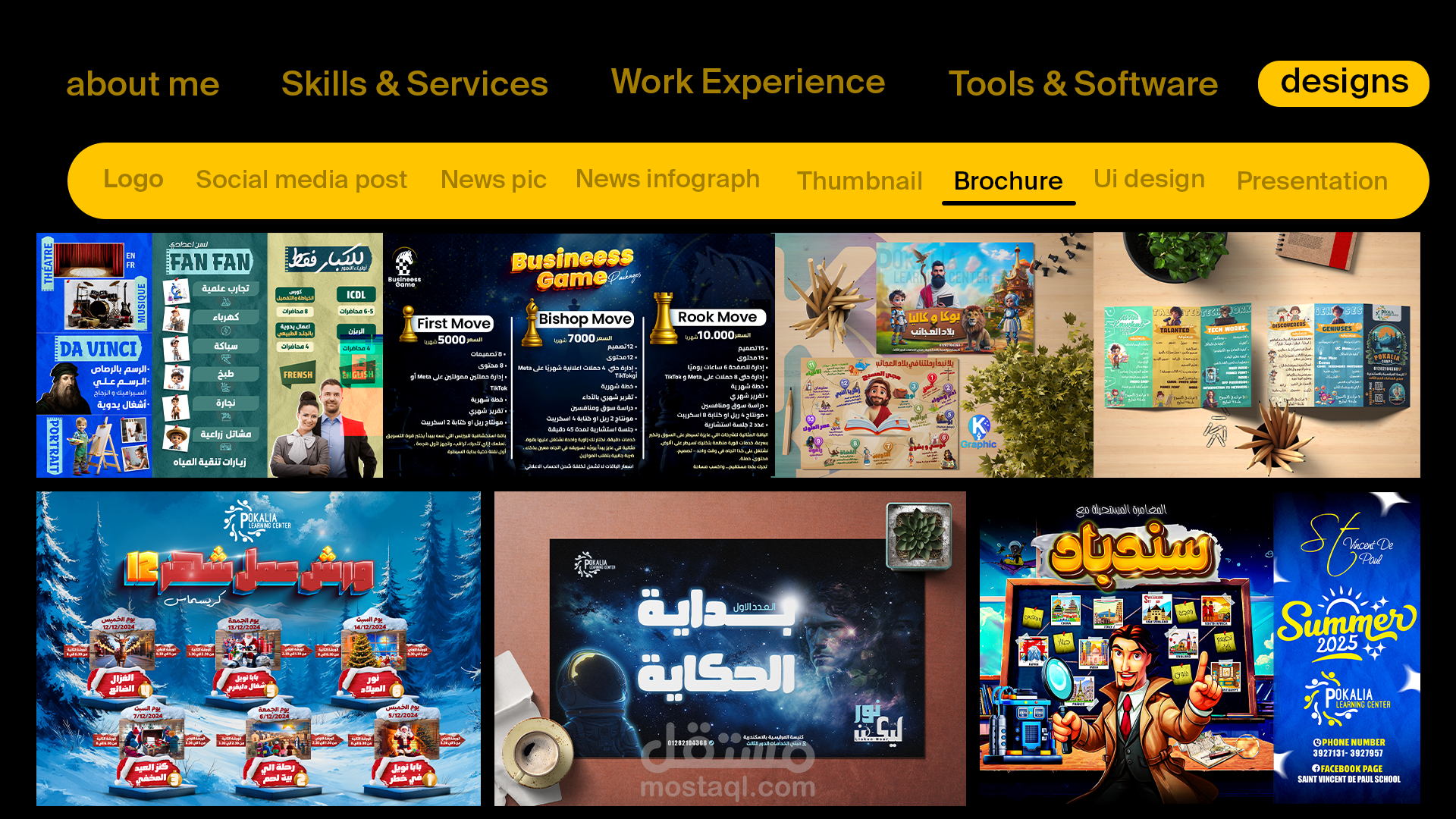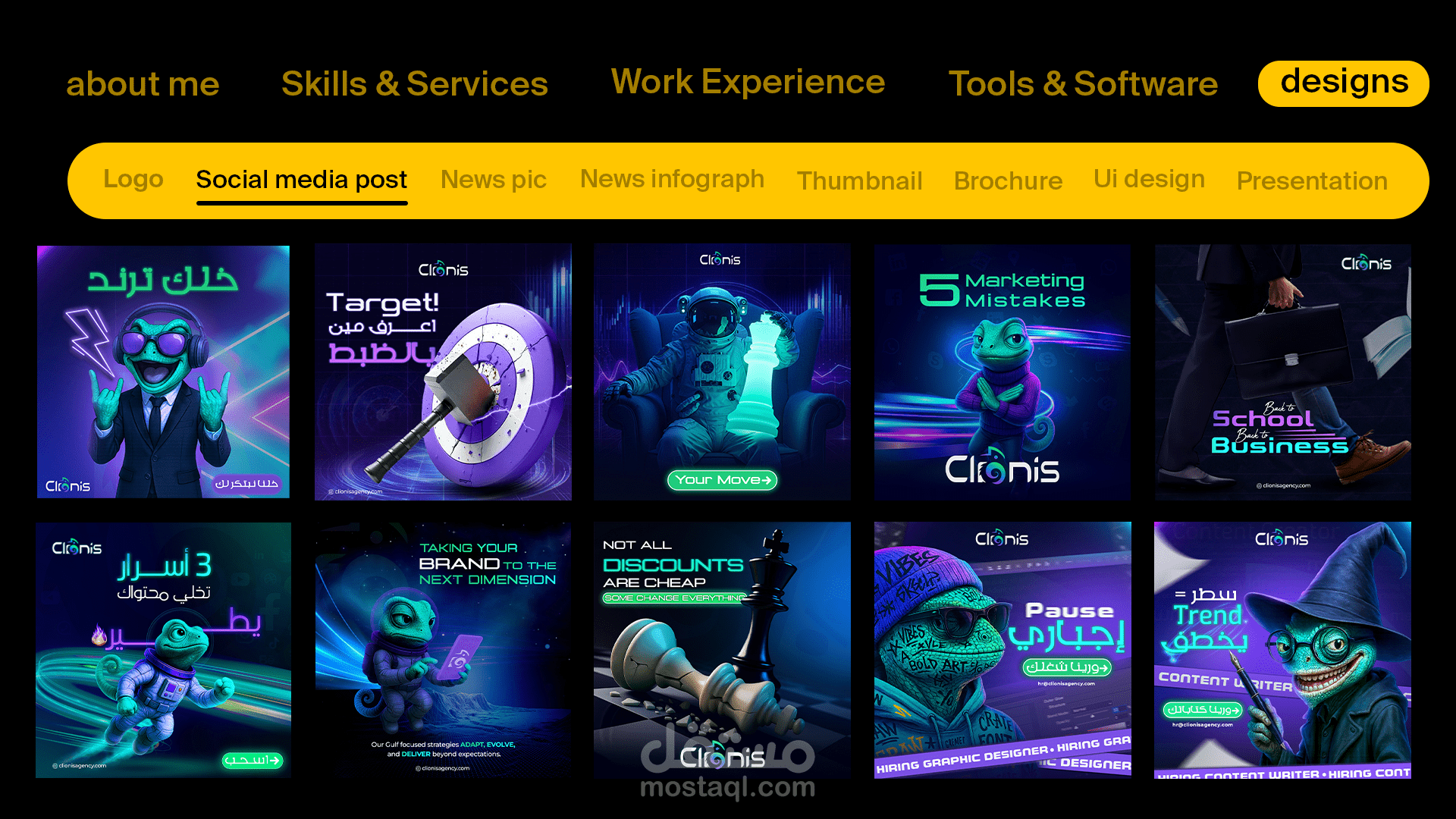 My portfolio includes social media designs in various fields, thumbnail designs, logos, and user interface designs.