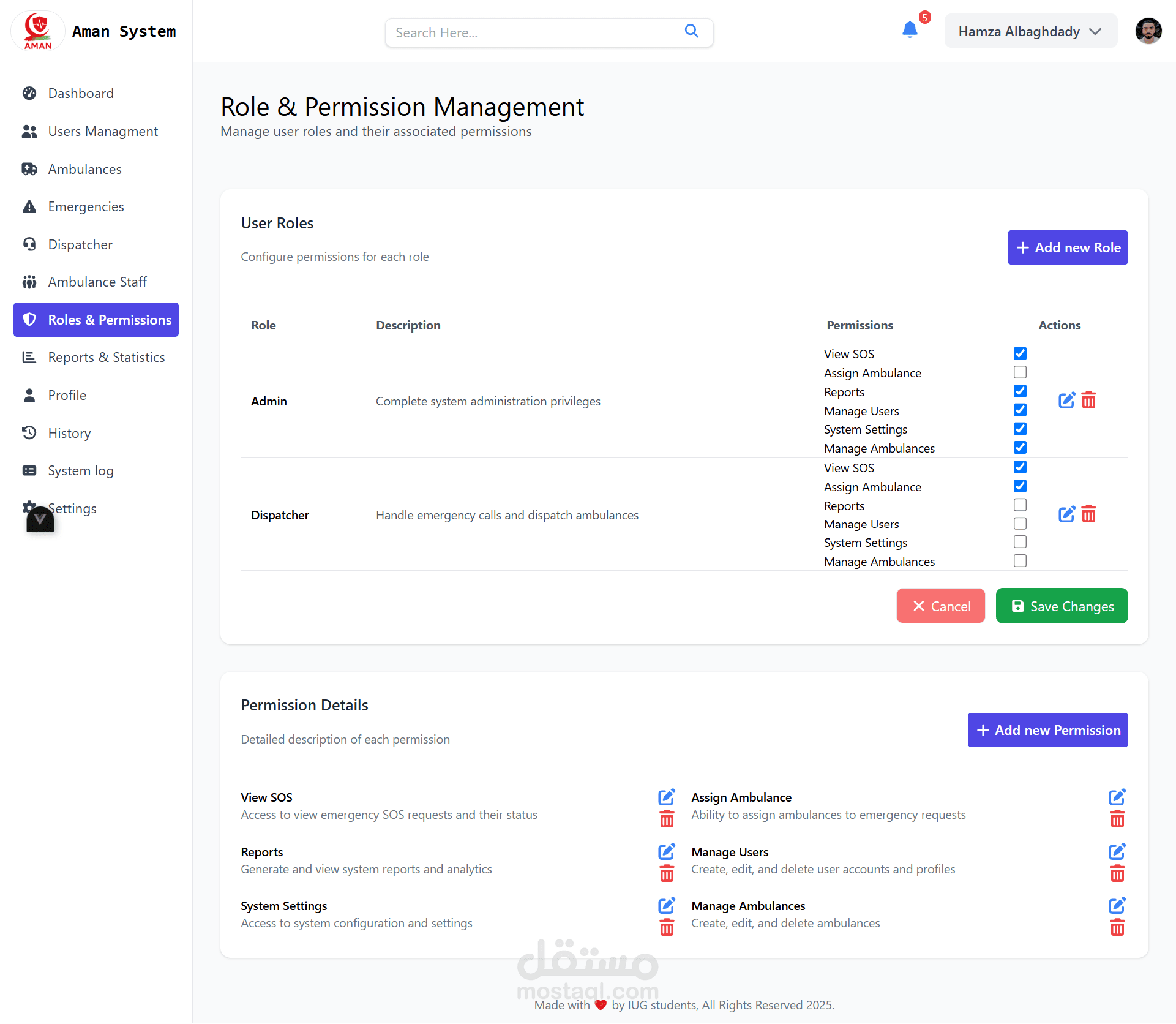 يتميز النظام بوجود نظام مصادقة (Authentication) آمن لكل من المديرين (Admins) والموزعين (Dispatchers)، بالإضافة إلى نظام صلاحيات متقدم يتيح للمدير إضافة أدوار جديدة أو تعديل صلاحيات كل دور بشكل مرن.