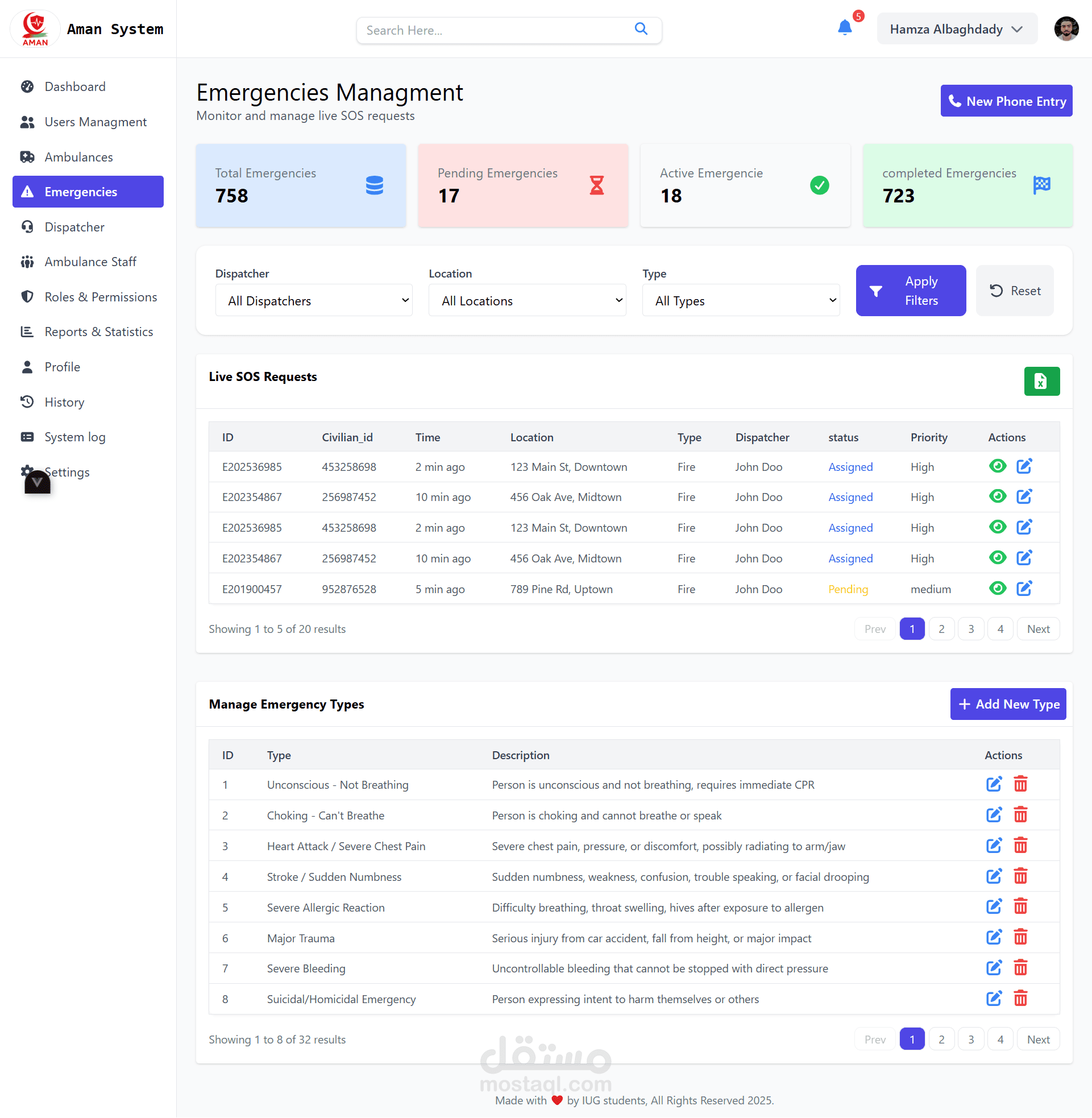 يهدف هذا المشروع إلى إدارة وتنظيم موارد جمعية الهلال الأحمر الفلسطيني (PRCS) مثل سيارات الإسعاف، والمسعفين، والموزعين، والمديرين، ونقاط الإسعاف، مع التركيز على التنسيق الفوري والتعامل مع حالات الطوارئ في الوقت الحقيقي.