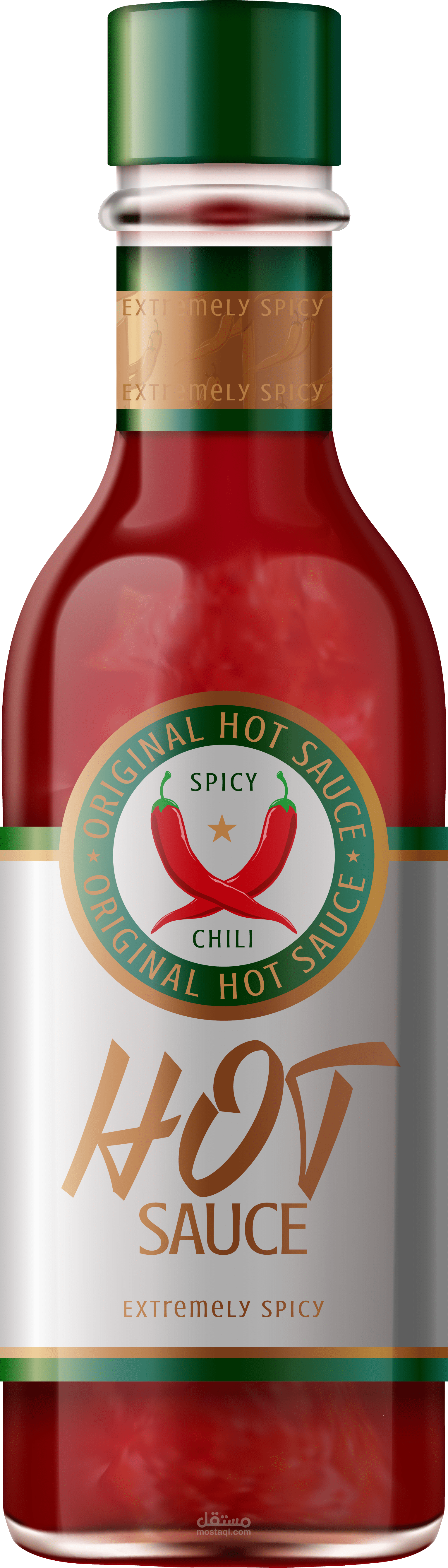 زجاجة Hot Sauce في المنتصف بشكل بارز كـ "Hero Product"، خلفية التصميم عبارة عن خليط من اللهب والنار والألوان الحمراء والبرتقالي، وده بيدي إحساس بالقوة والحرارة. حوالين الزجاجة فيه قرون فلفل أحمر متطايرة، وده بيعزز فكرة الطعم الحار جدًا. الألوان (الأحمر، البرتقالي، الذهبي) متناسقة مع هوية المنتج ومؤثرة بصريًا. كمان انعكاسات الإضاءة والشرر الناري مديين إحساس بالحركة والطاقة.