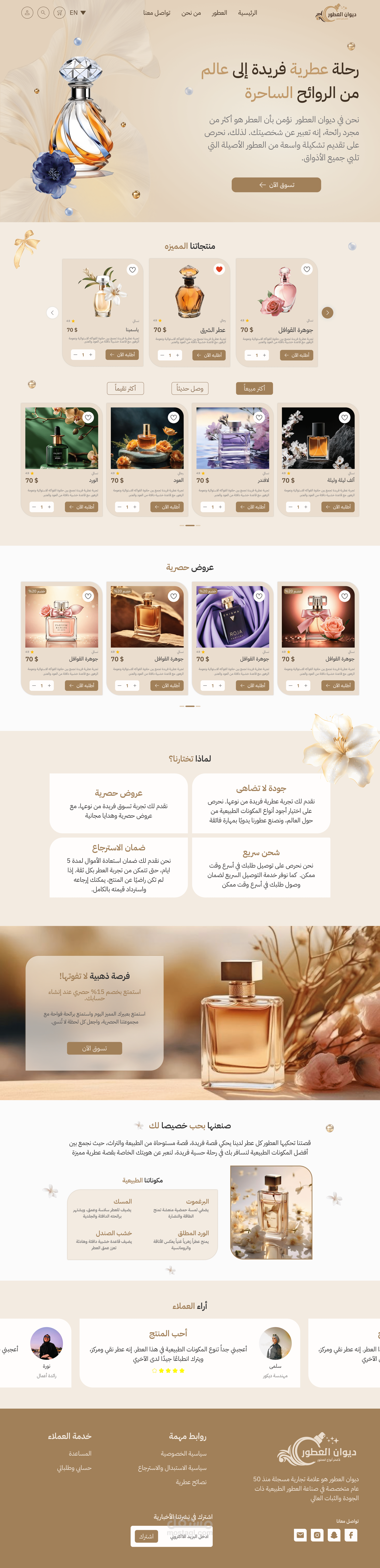 واجهة مميزة تنقل المستخدم في رحلة حسية بصرية إلى عالم من الروائح الساحرة، مع تجربة تصفح انسيابية تجمع بين الجمال والوظيفية.
