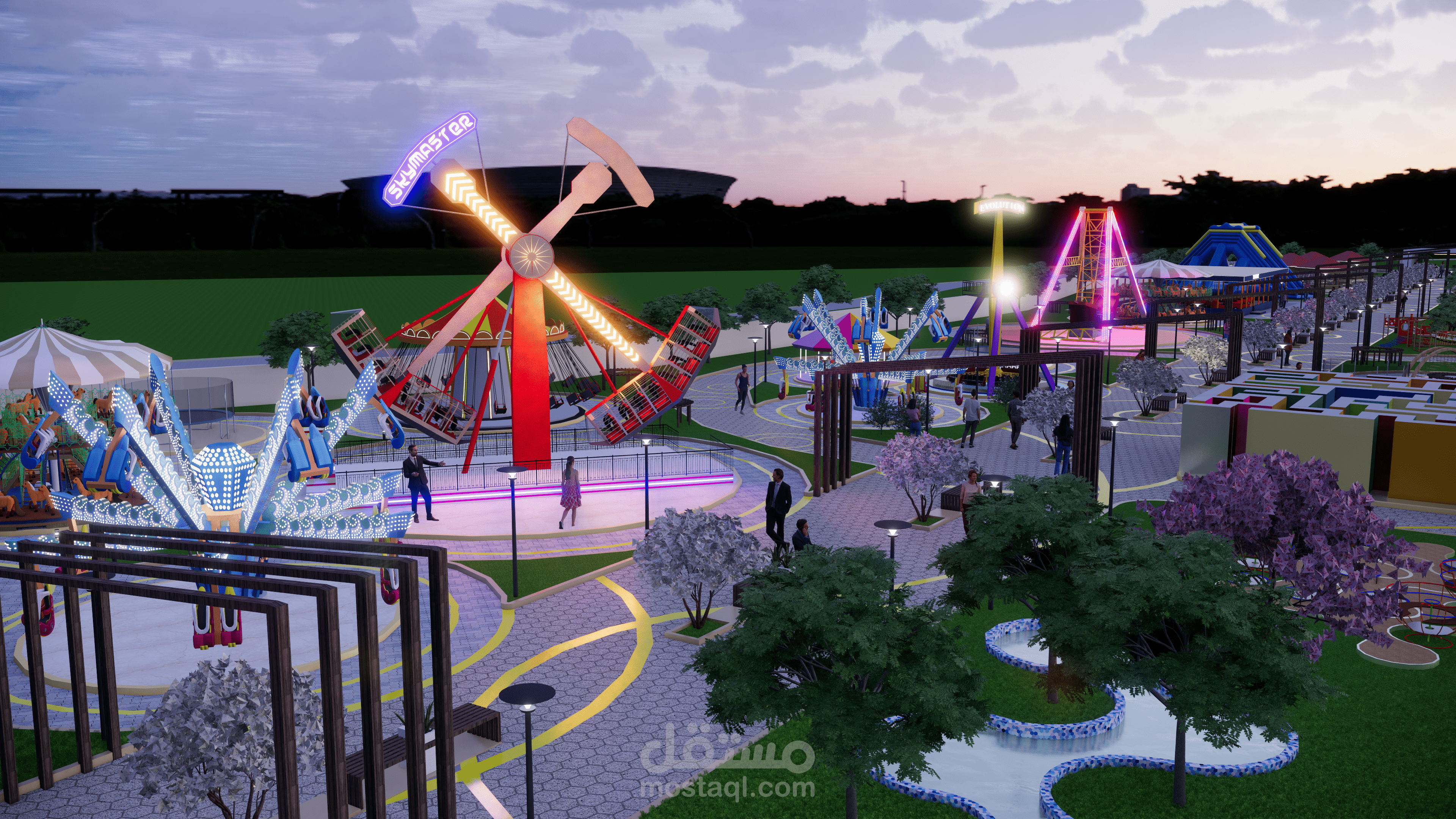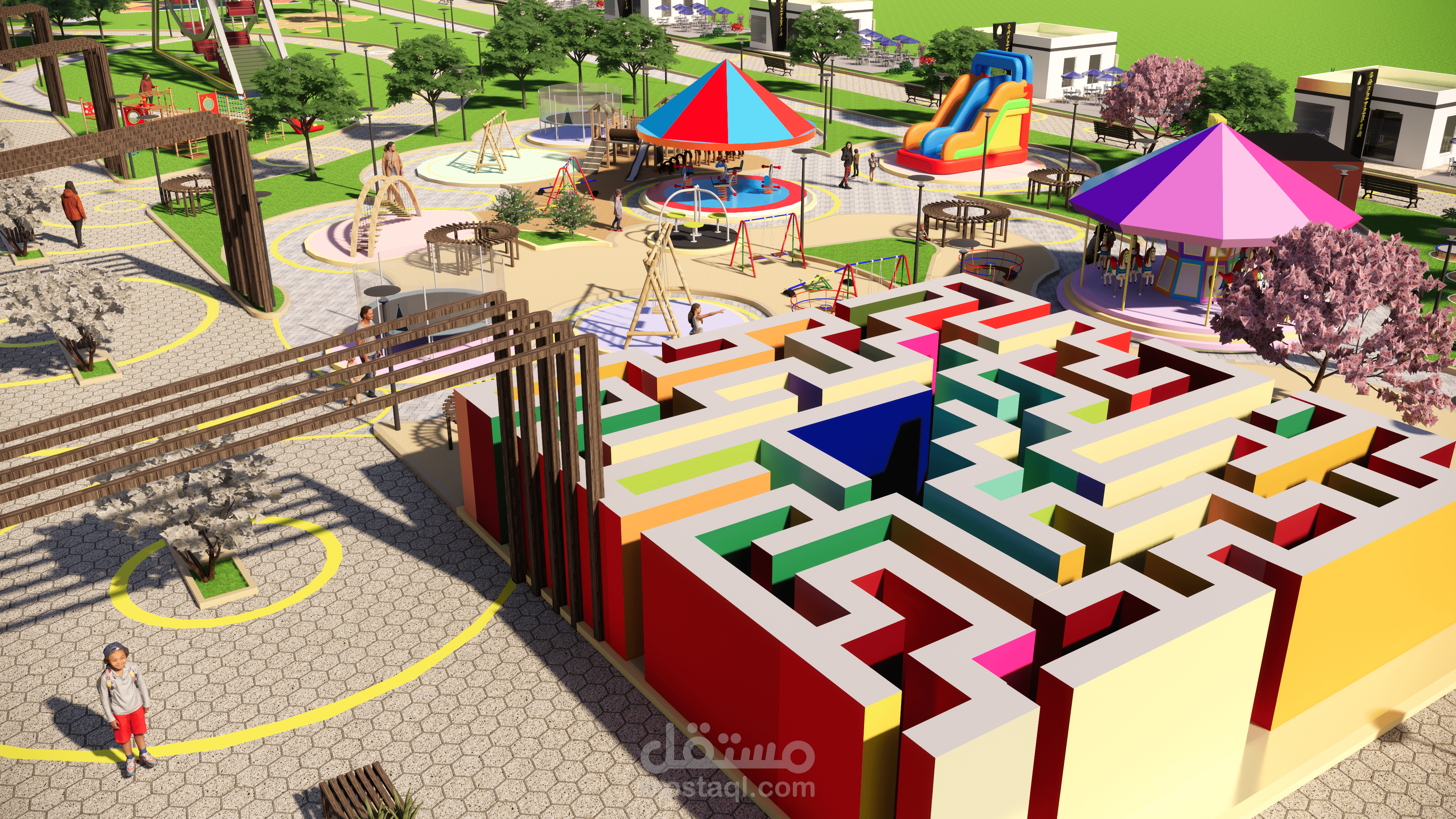 العمل من إنجازي باستخدام AutoCAD – SketchUp – Enscape، مع الحرص على تحقيق تجربة ترفيهية مريحة وآمنة في إطار تصميم حضري عصري وممتع.