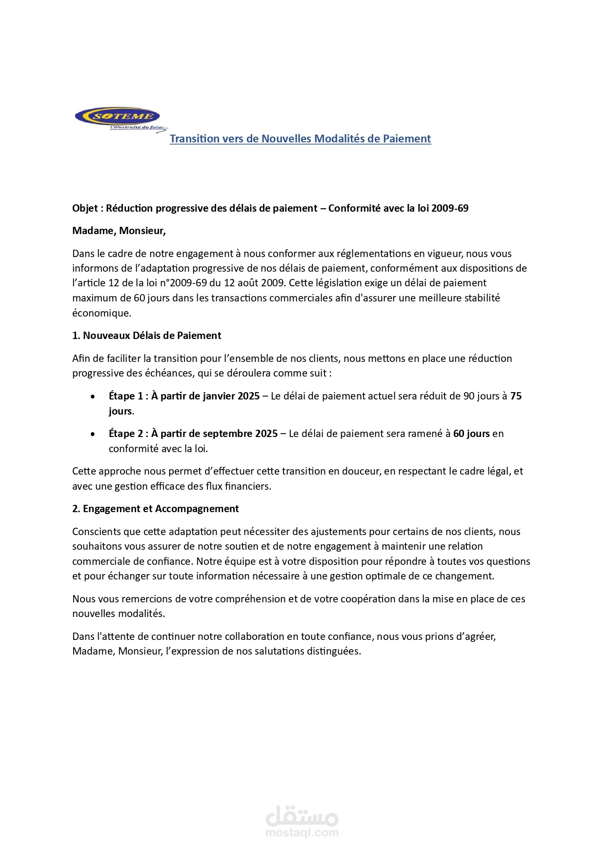 J’ai préparé deux versions d’une lettre officielle à destination des clients, visant à les informer de la **réduction progressive des délais de paiement** conformément à la **loi n°2009-69 du 12 août 2009**.