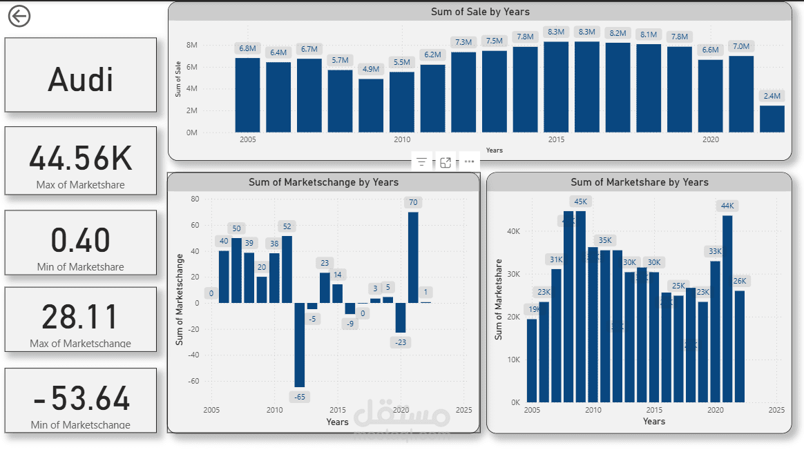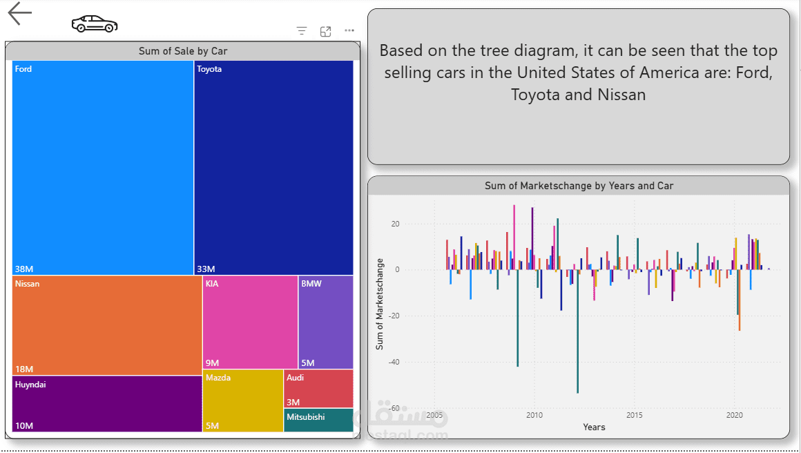 صممت لوحة تحكم تفاعلية شاملة لتحليل بيانات مبيعات السيارات باستخدام Power BI، بهدف مساعدة الإدارة على تتبع الأداء وتحليل الاتجاهات بسهولة.