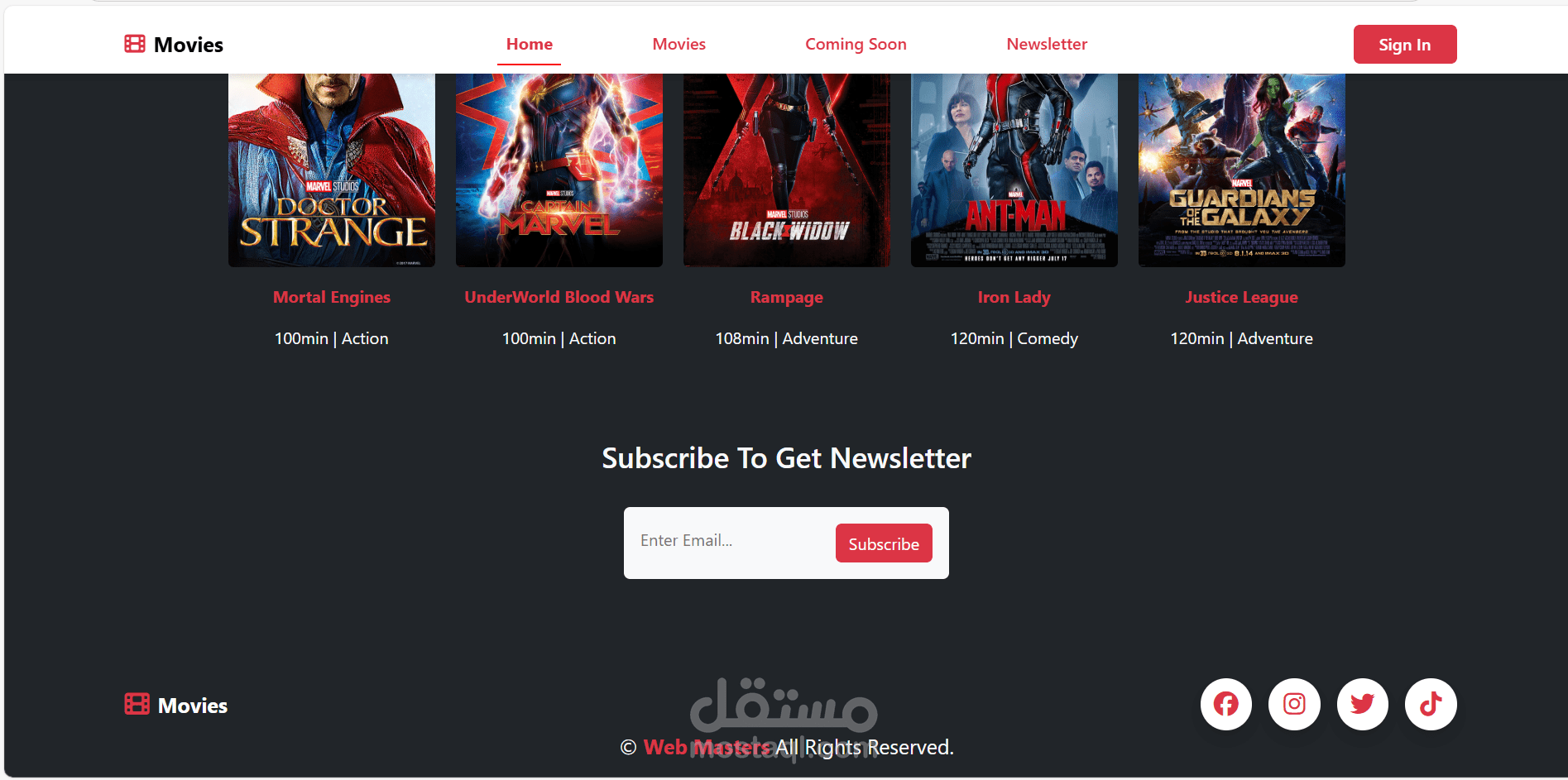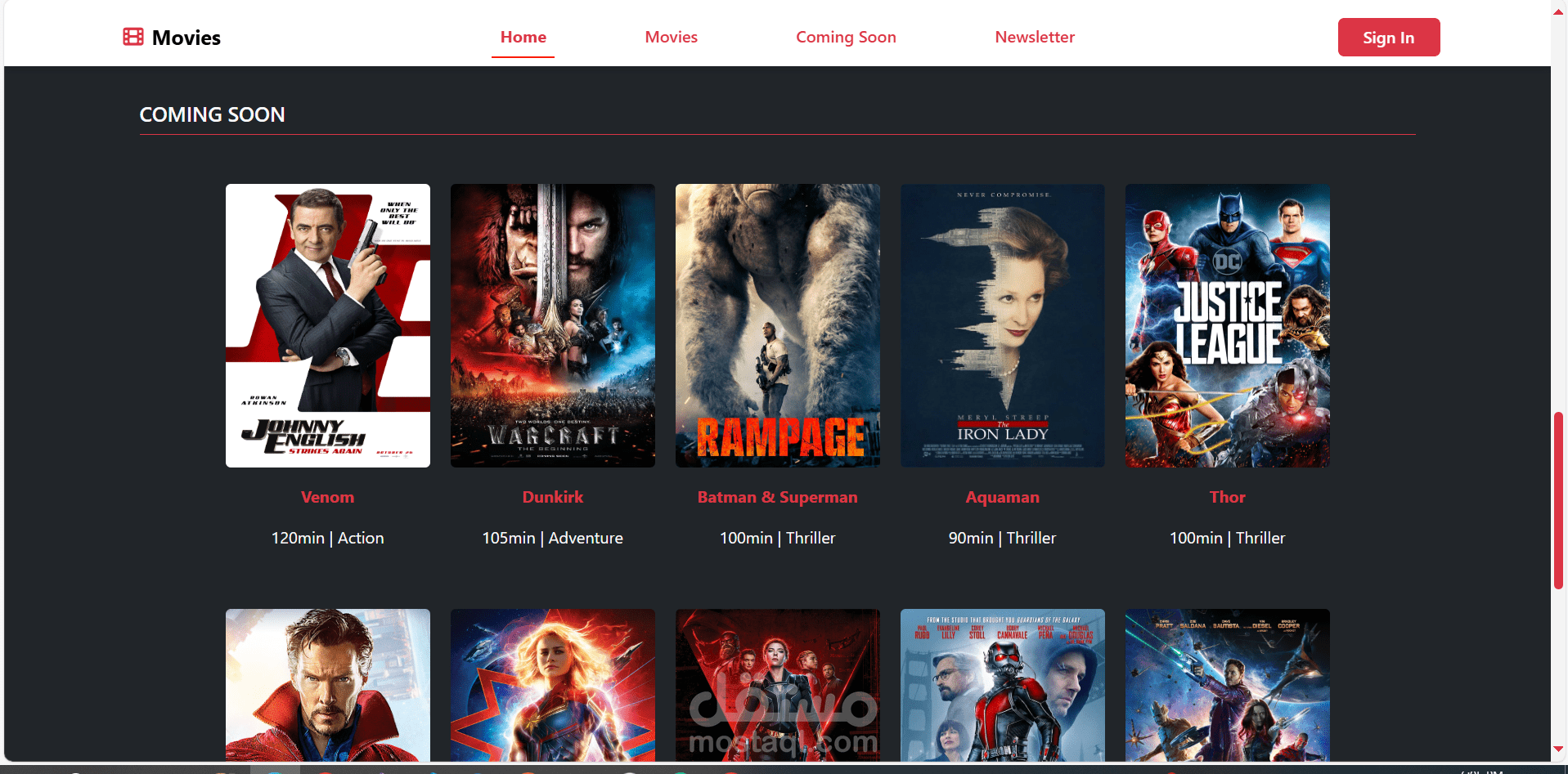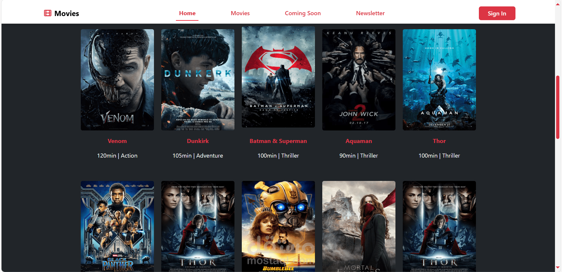 قمت بتصميم وتطوير موقع أفلام ترفيهي متكامل يعرض مجموعة من أشهر وأحدث الأفلام العالمية بطريقة جذابة ومنظمة.