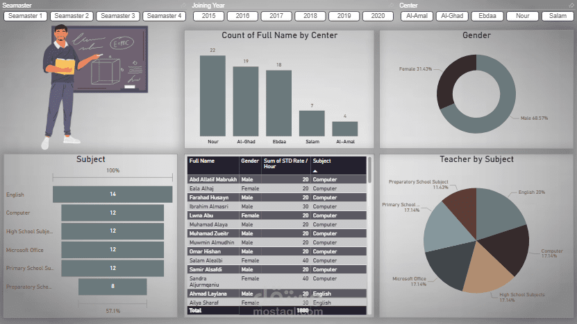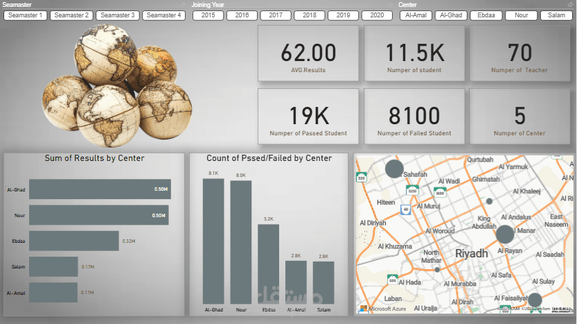 ركز المشروع على بناء لوحة معلومات تفاعلية لعرض وتحليل بيانات الطلاب والمعلمين في مختلف المراكز التعليمية. وكان الهدف الرئيسي تحويل مجموعات البيانات الخام الضخمة إلى رؤى بصرية واضحة تدعم عملية اتخاذ القرار.