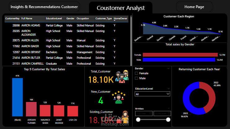 تحليل رؤى العملاء: الجنس، والمستوى التعليمي، والعملاء العائدين مقابل العملاء الجدد.