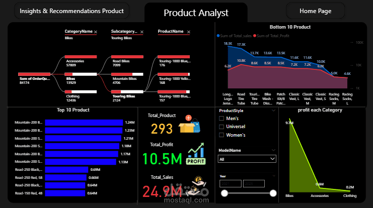 تحليل المنتج: أفضل المنتجات وأقلها أداءً، وإجمالي المبيعات، واتجاهات الأرباح.