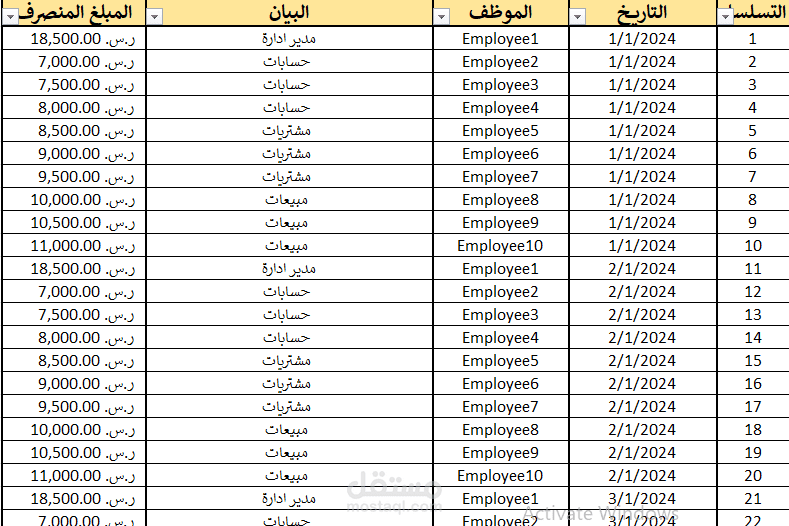 إدخال البيانات اليومية (المبيعات، المشتريات، المصروفات) في شيت Excel منسق.