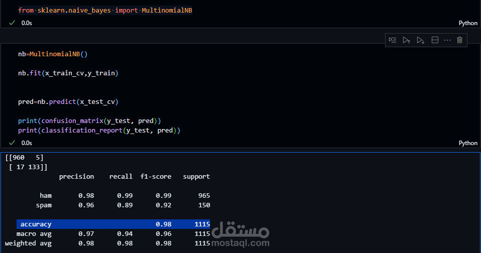 تدريب النماذج: استخدام خوارزميات تعلم الآلة مثل Naive Bayes وLogistic Regression وSVM لتصنيف الرسائل بدقة عالية.