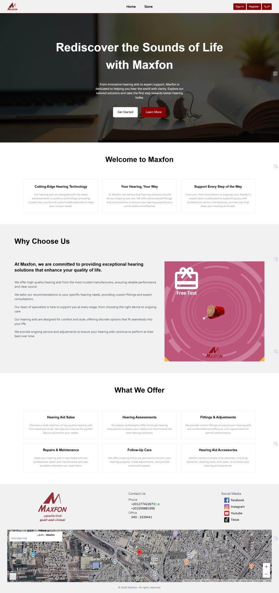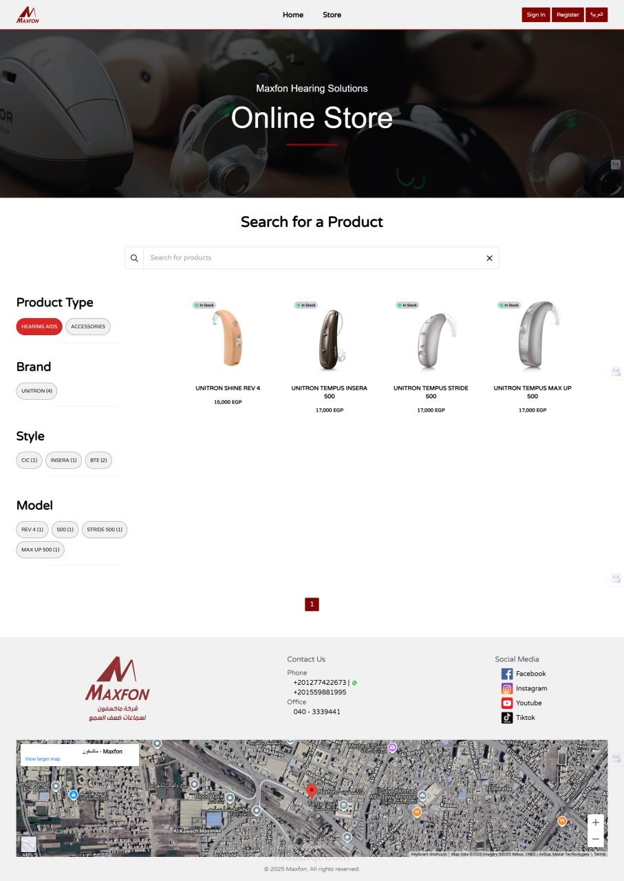 مشروع ماكسفون هو منصة تجارة إلكترونية متكاملة ومتعددة اللغات تم تطويرها خصيصًا لشركة متخصّصة في بيع أجهزة السمع وحلول ضعف السمع. صُمّمت المنصة لتقدّم تجربة تسوّق سهلة، موثوقة، وسريعة، تتيح للمستخدمين استعراض أجهزة السمع من مختلف العلامات التجارية العالمية ومقارنتها وشرائها بكل سهولة.