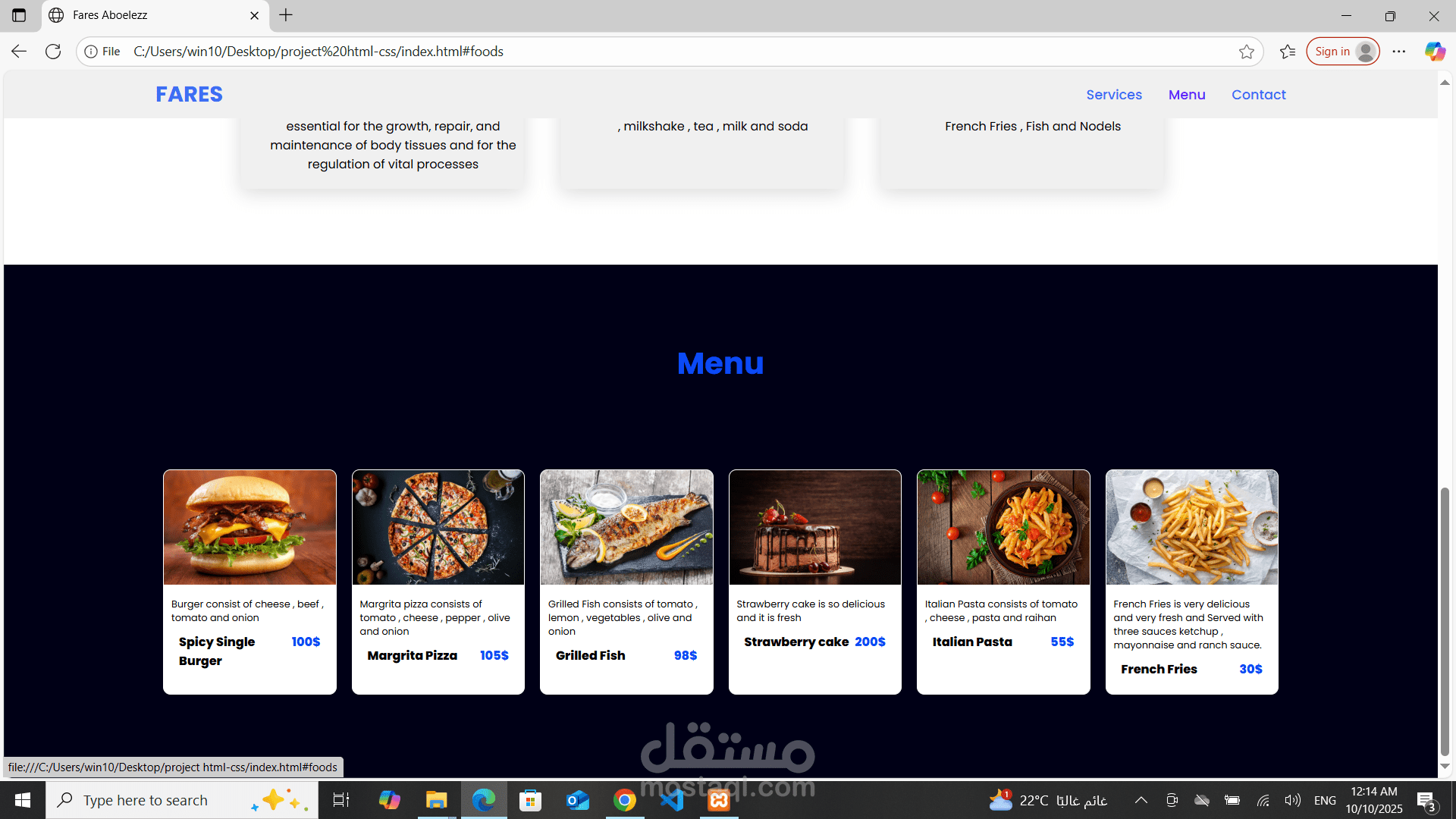 صفحة لعرض وصفات وأعمال الشيف مع تفاصيل كل طبق.