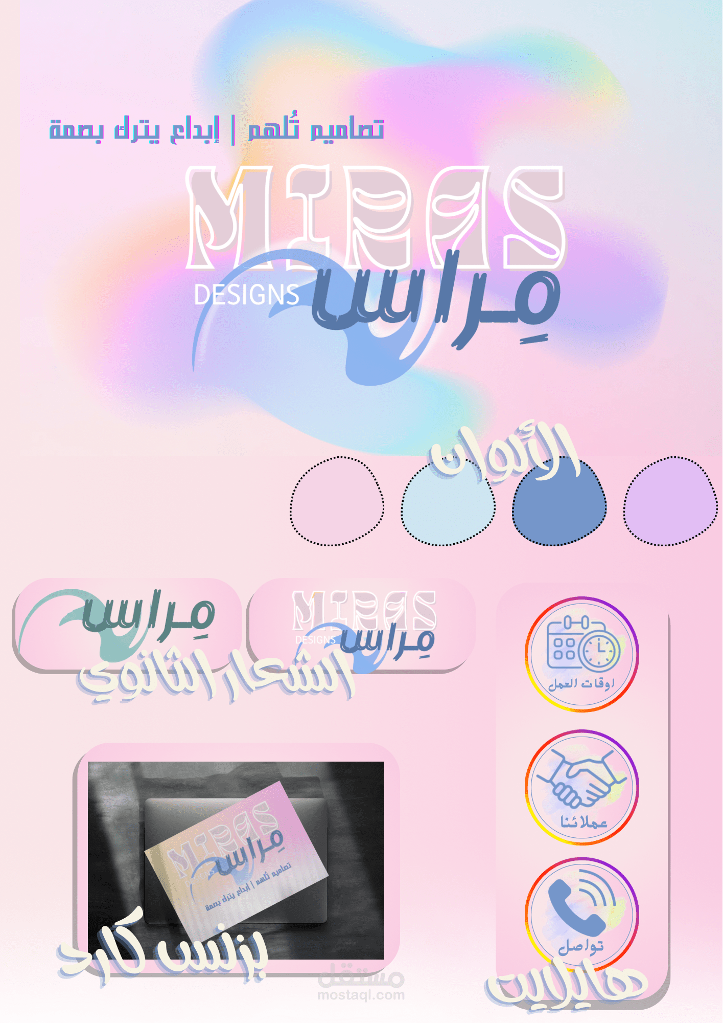 تصميم الهوية البصرية لمِراس يتميّز بألوان هادئة تعكس الإبداع والاحتراف.