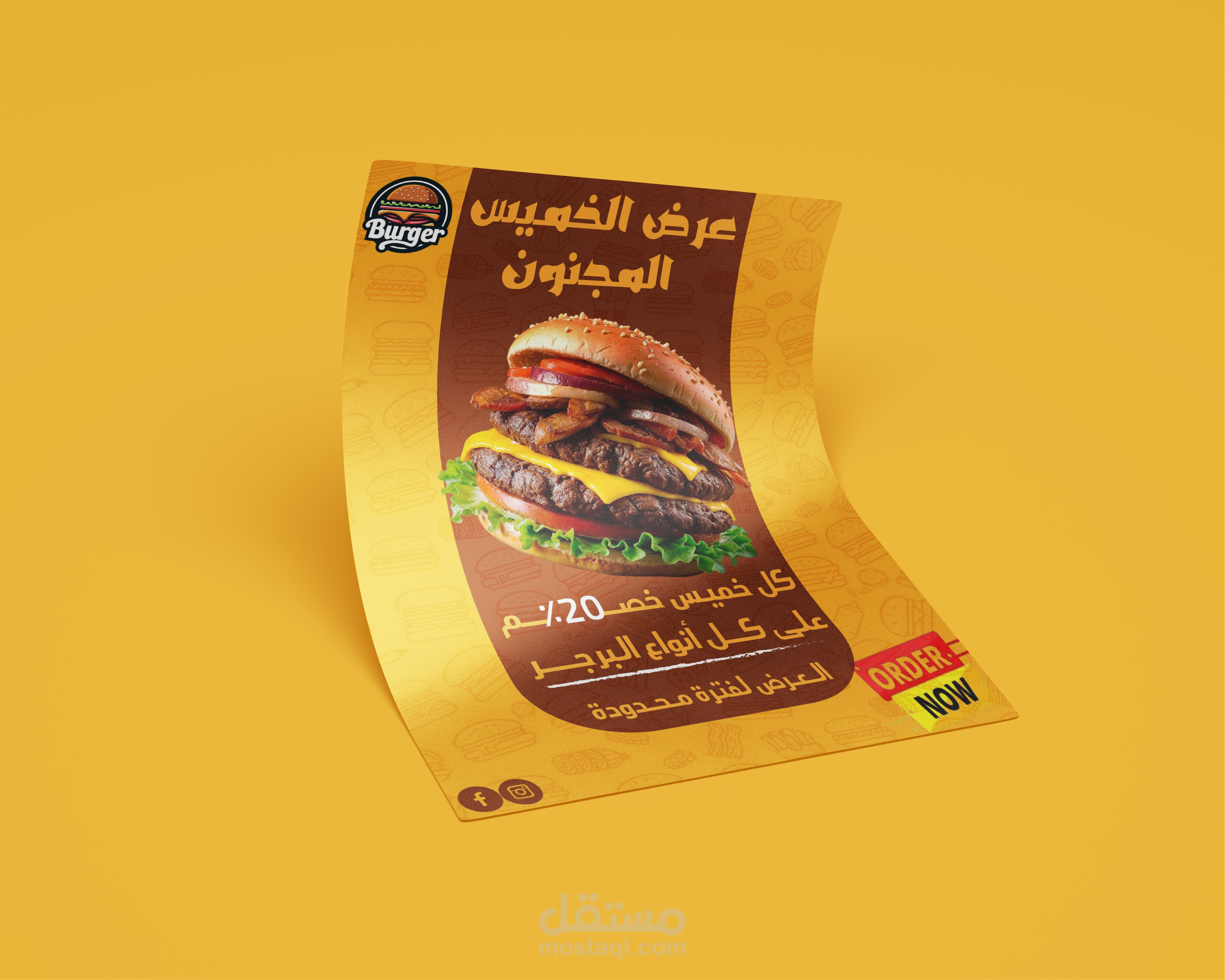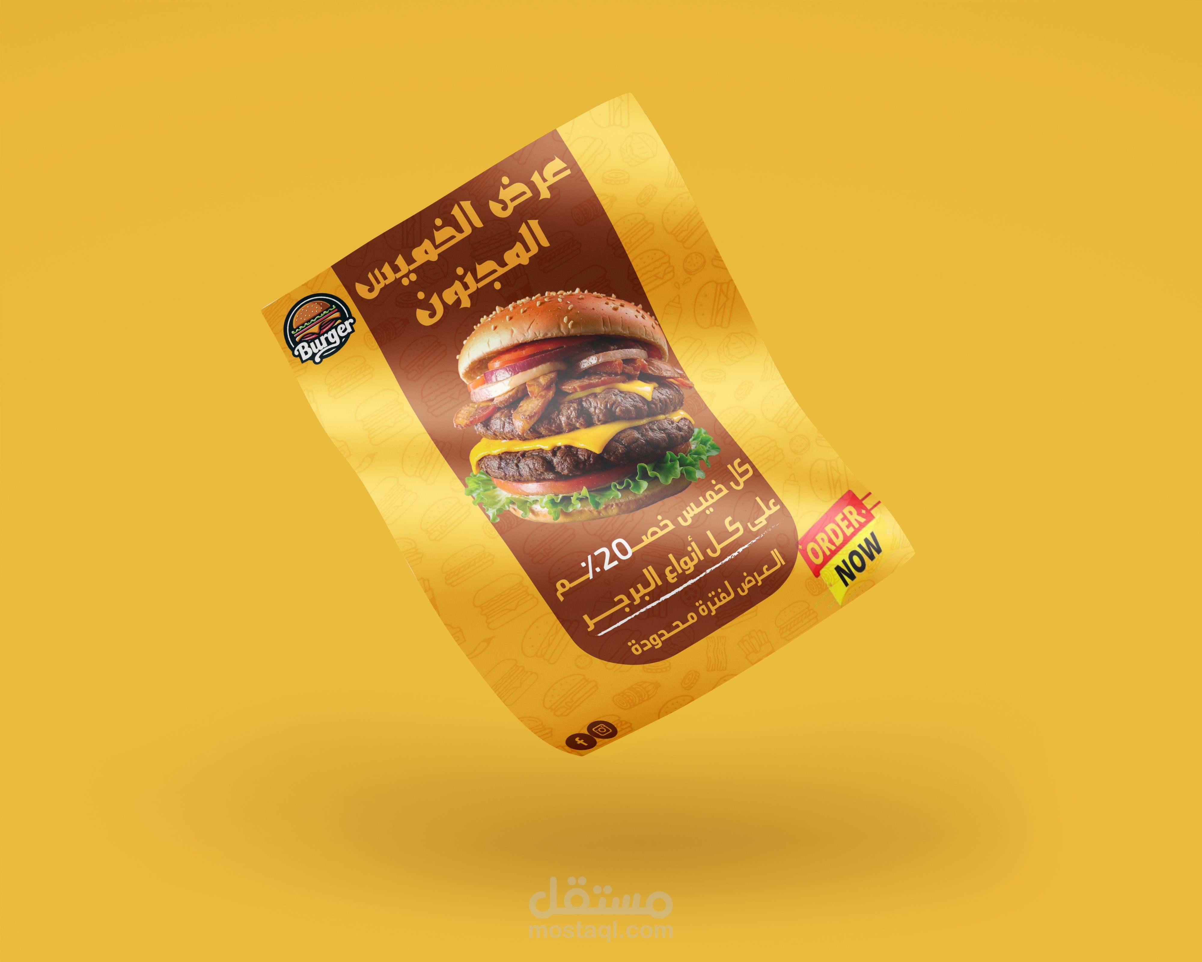 تصميم جذاب وحيوي لإعلان عرض الخميس المجنون من مطعم برجر، يعرض خصم 20% على جميع أنواع البرجر بطريقة لافتة ومُغرية.