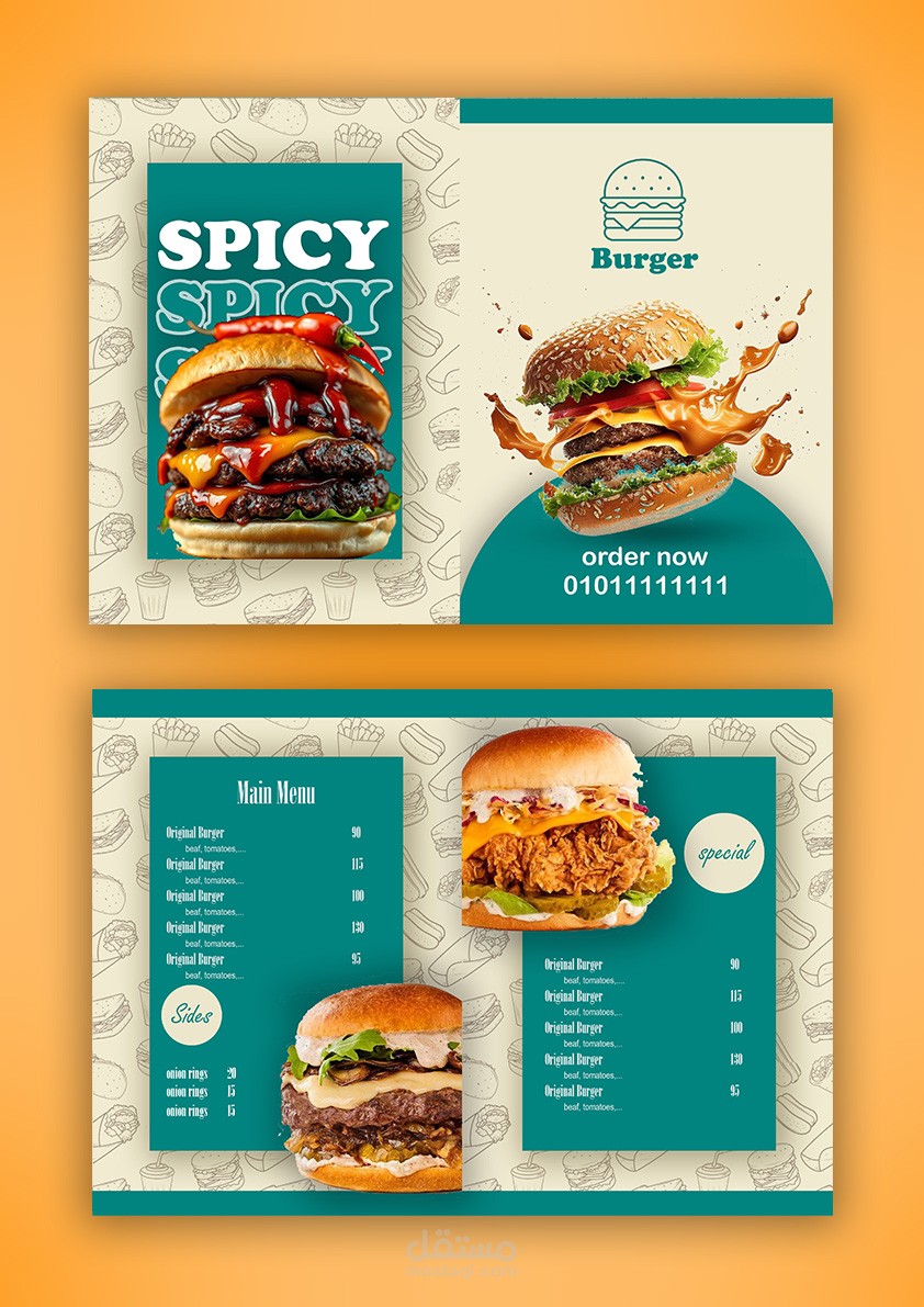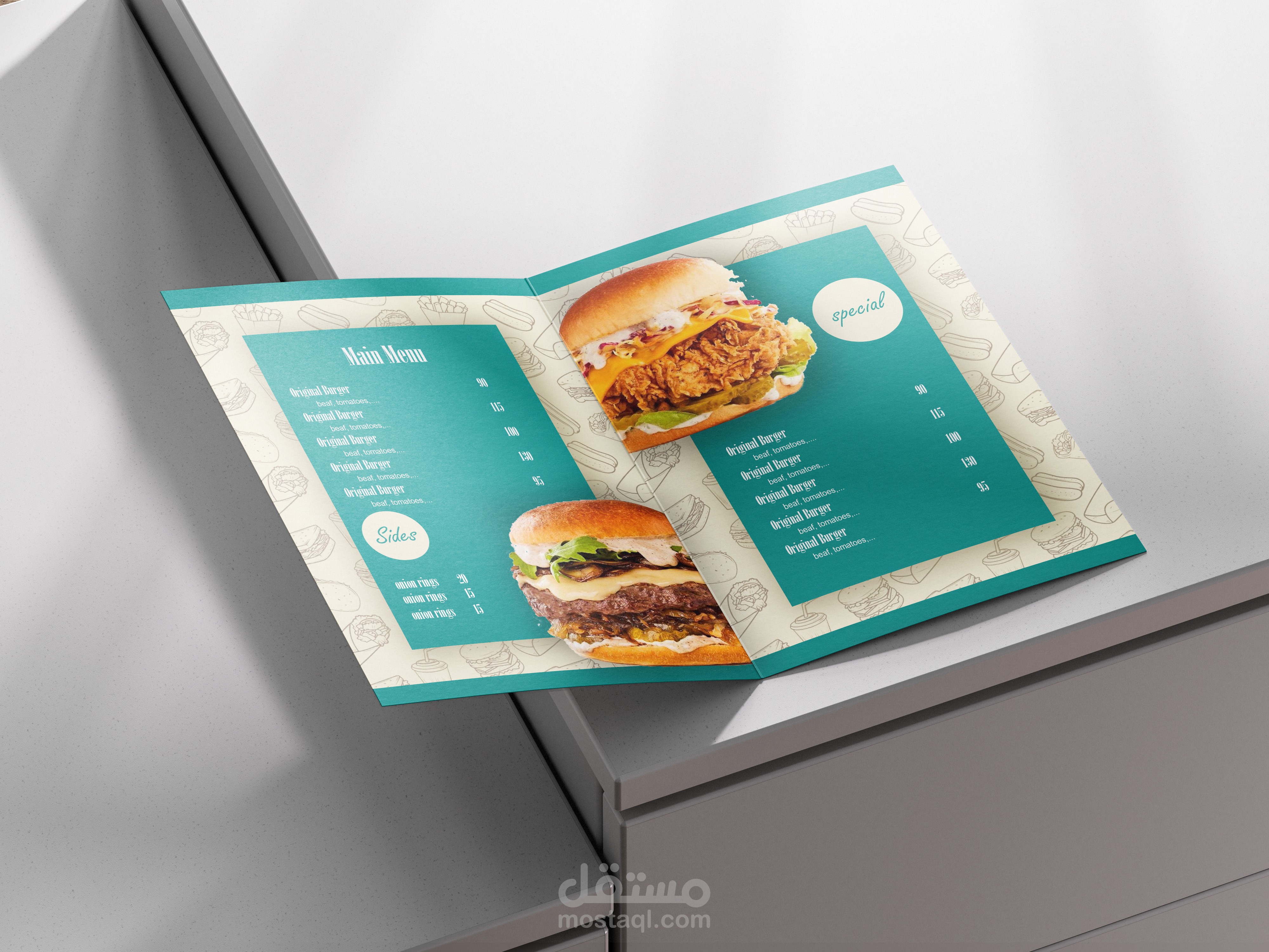 تصميم منيو لمطعم برجر بأسلوب بسيط و ألوان حيوية تعبر عن شخصية المكان.