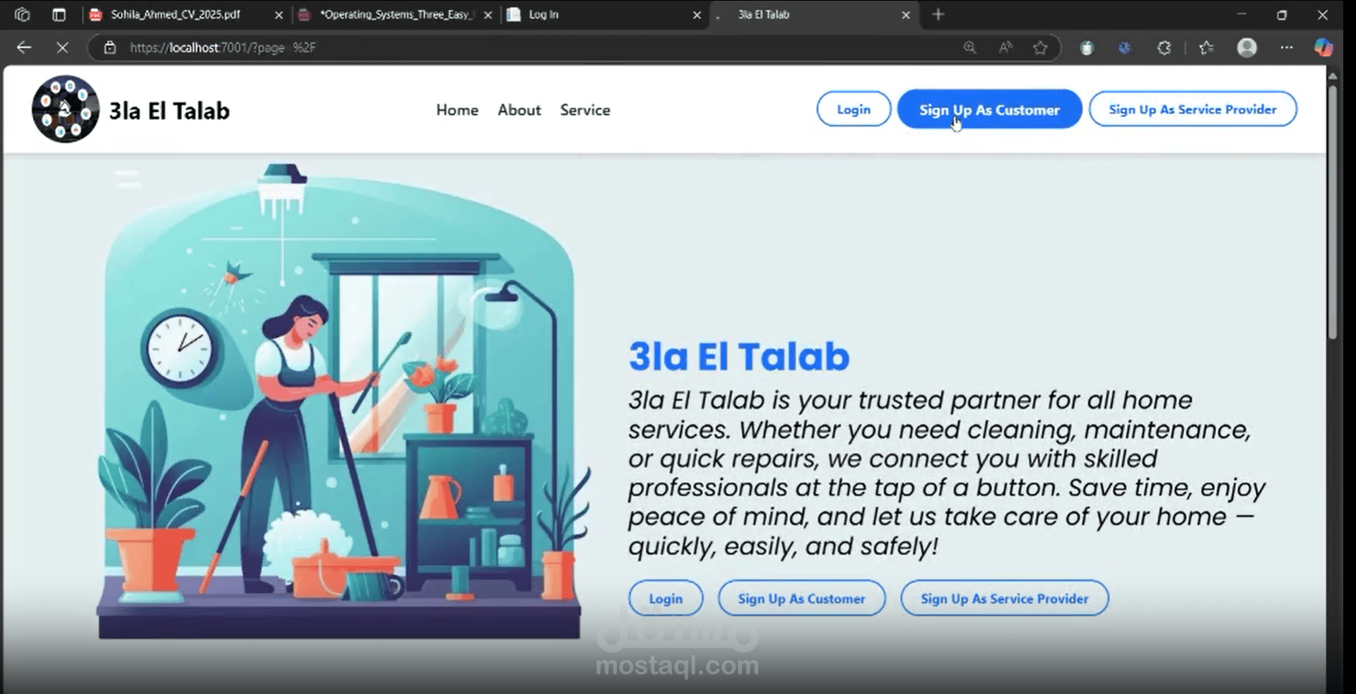 سأقوم بإنشاء موقع ويب مخصص لخدمات المنزل يشمل مجموعة متنوعة من الخدمات مثل التنظيف، الصيانة، السباكة، الكهرباء، ونقل الأثاث. الموقع يتيح للمستخدمين استعراض مقدمي الخدمات المتوفرين في مدينتهم، ومقارنة الخيارات المتاحة قبل الحجز. كما يمكنهم إجراء حجز الخدمة بشكل مباشر ومتابعة حالة الطلب أولًا بأول، مع إمكانية التعديل أو الإلغاء بناءً على إشعارات وتنبيهات مزود الخدمة. الموقع سيكون بتصميم عصري ومتجاوب مع جميع الأجهزة، ليمنح العملاء تجربة استخدام سهلة وسريعة تلبي احتياجاتهم اليومية بكفاءة واحترافية.