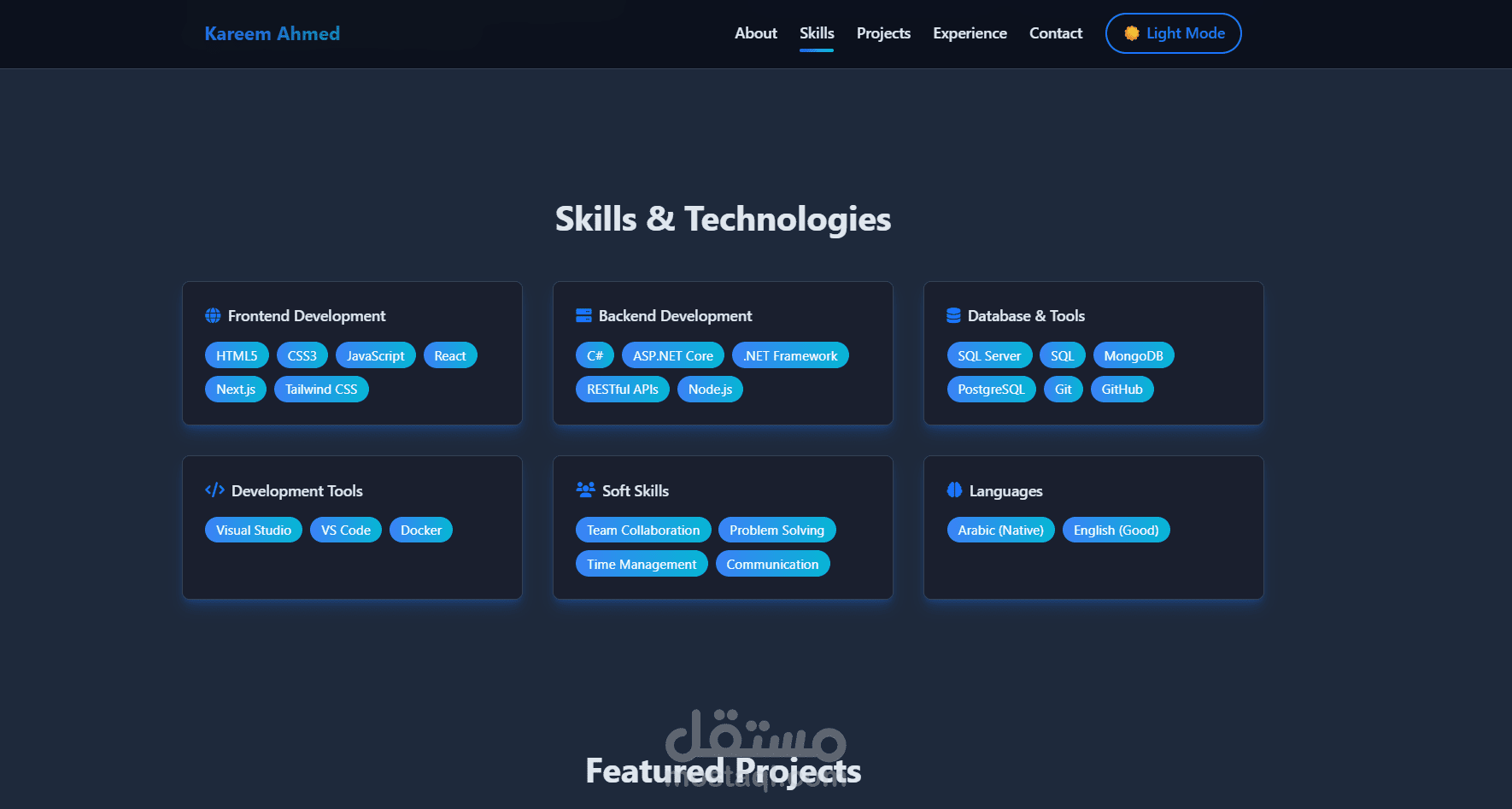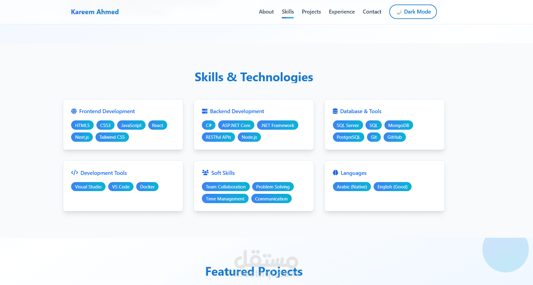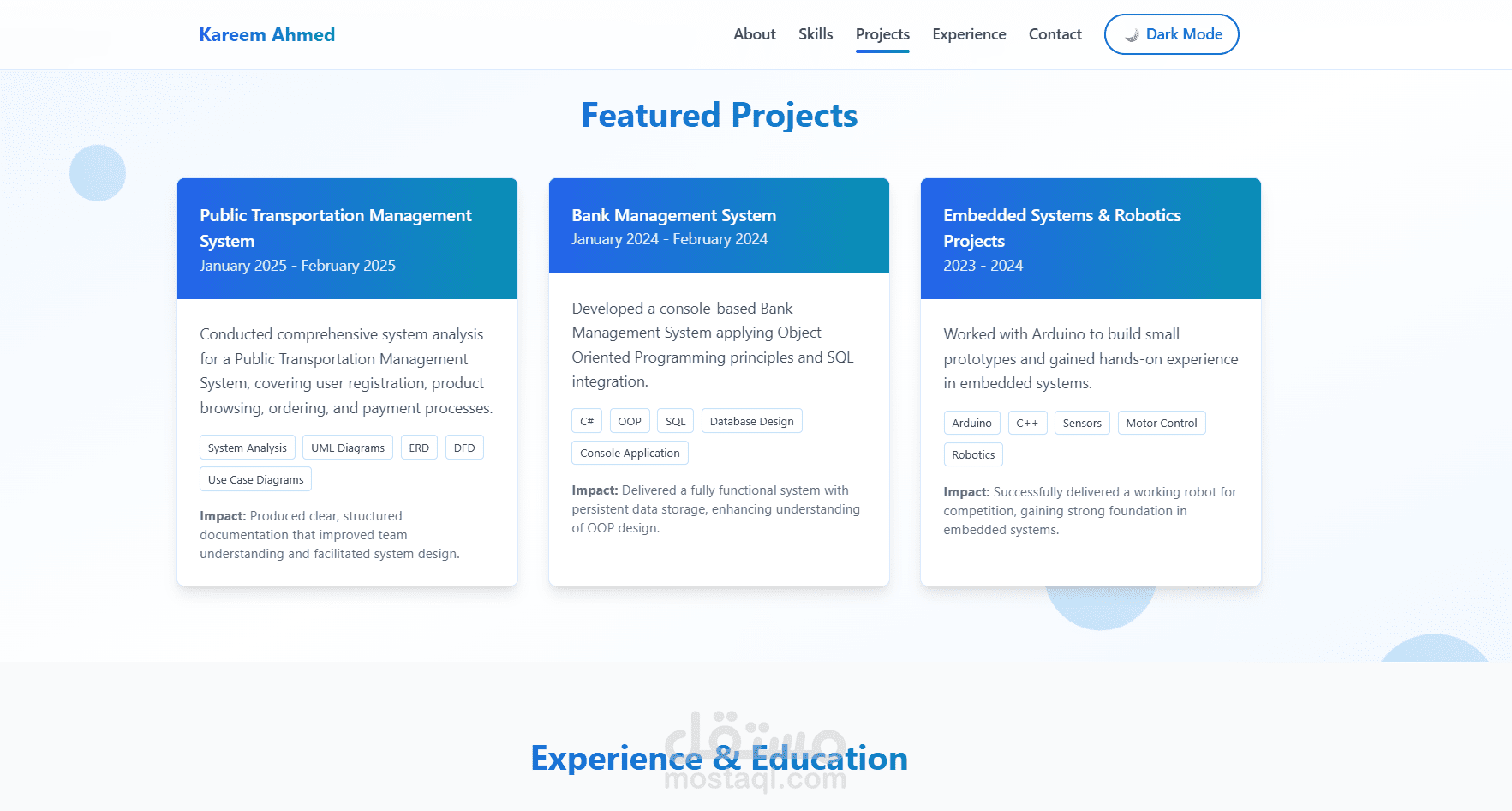 يُبرز الموقع شغفًا بتطوير الواجهات الأمامية والخلفية باستخدام تقنيات مثل ASP.NET Core، React، وSQL Server، مع تركيز على الأداء، القابلية للتوسّع، وتجربة المستخدم السلسة.