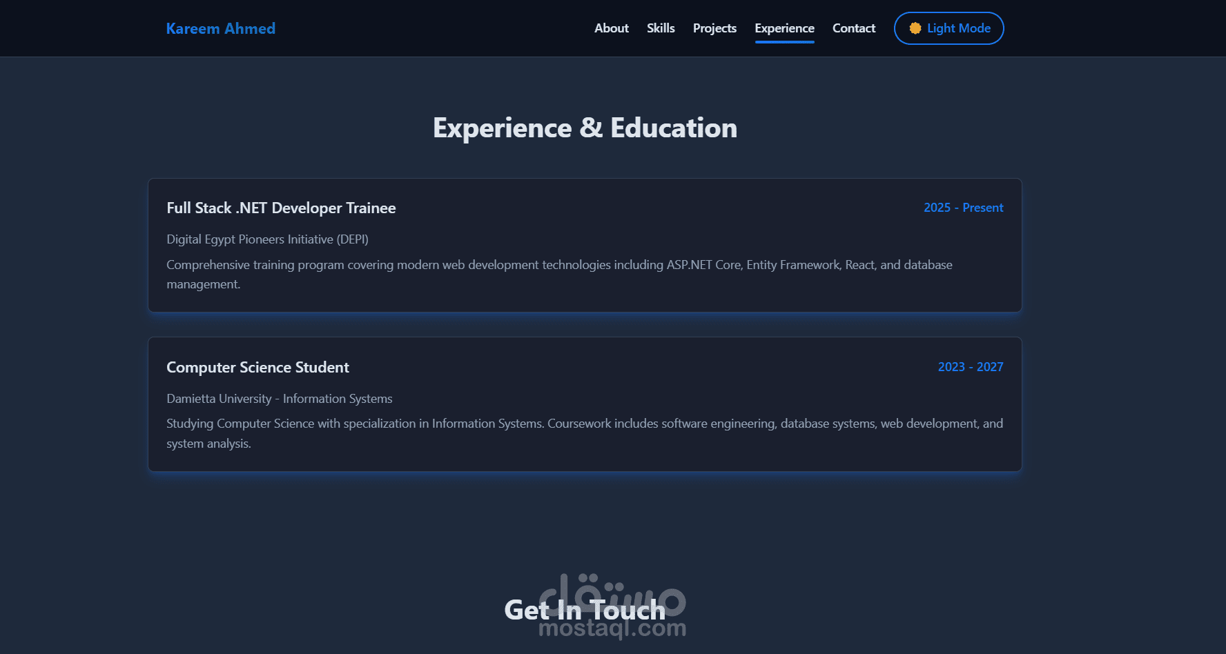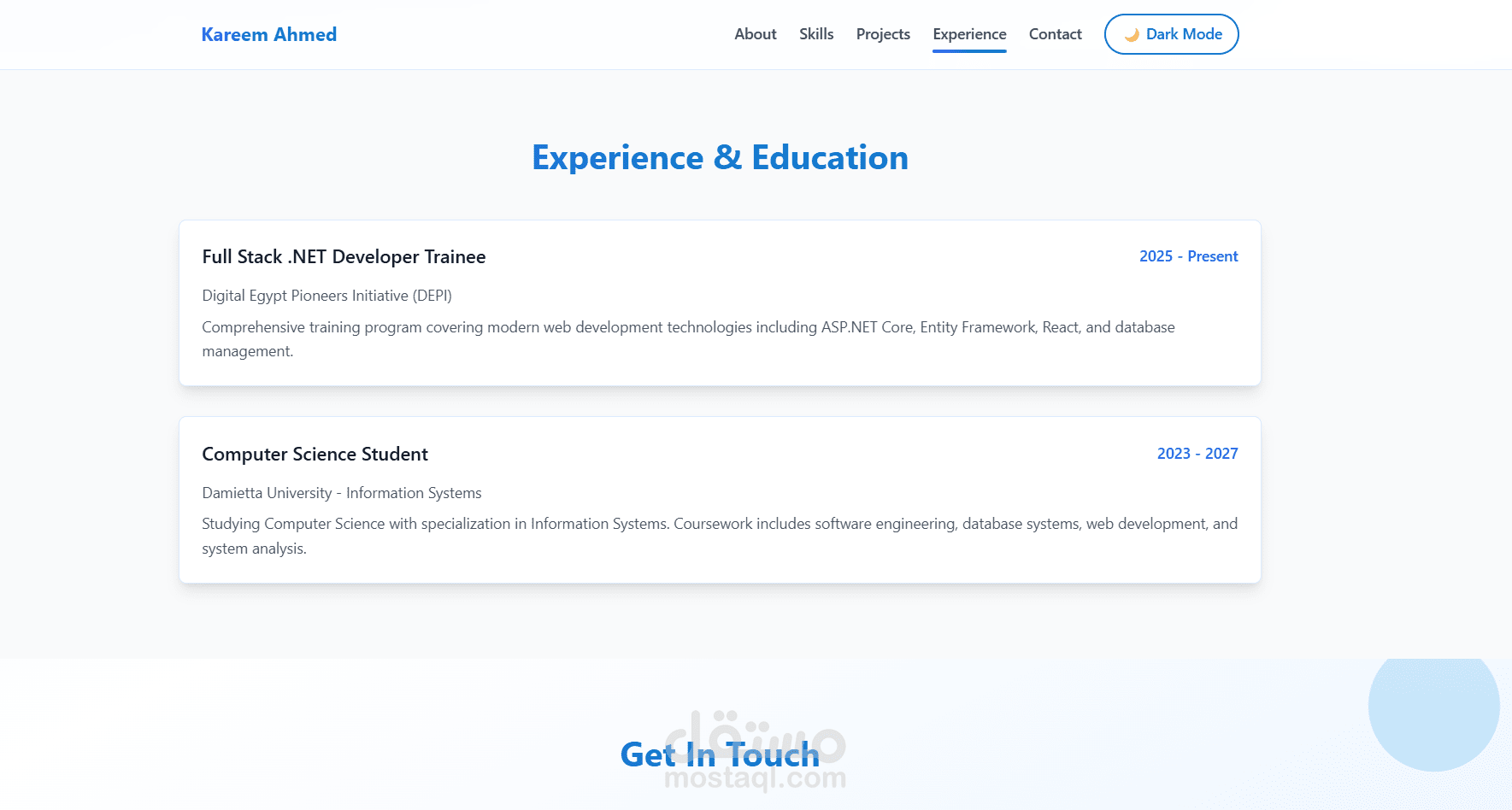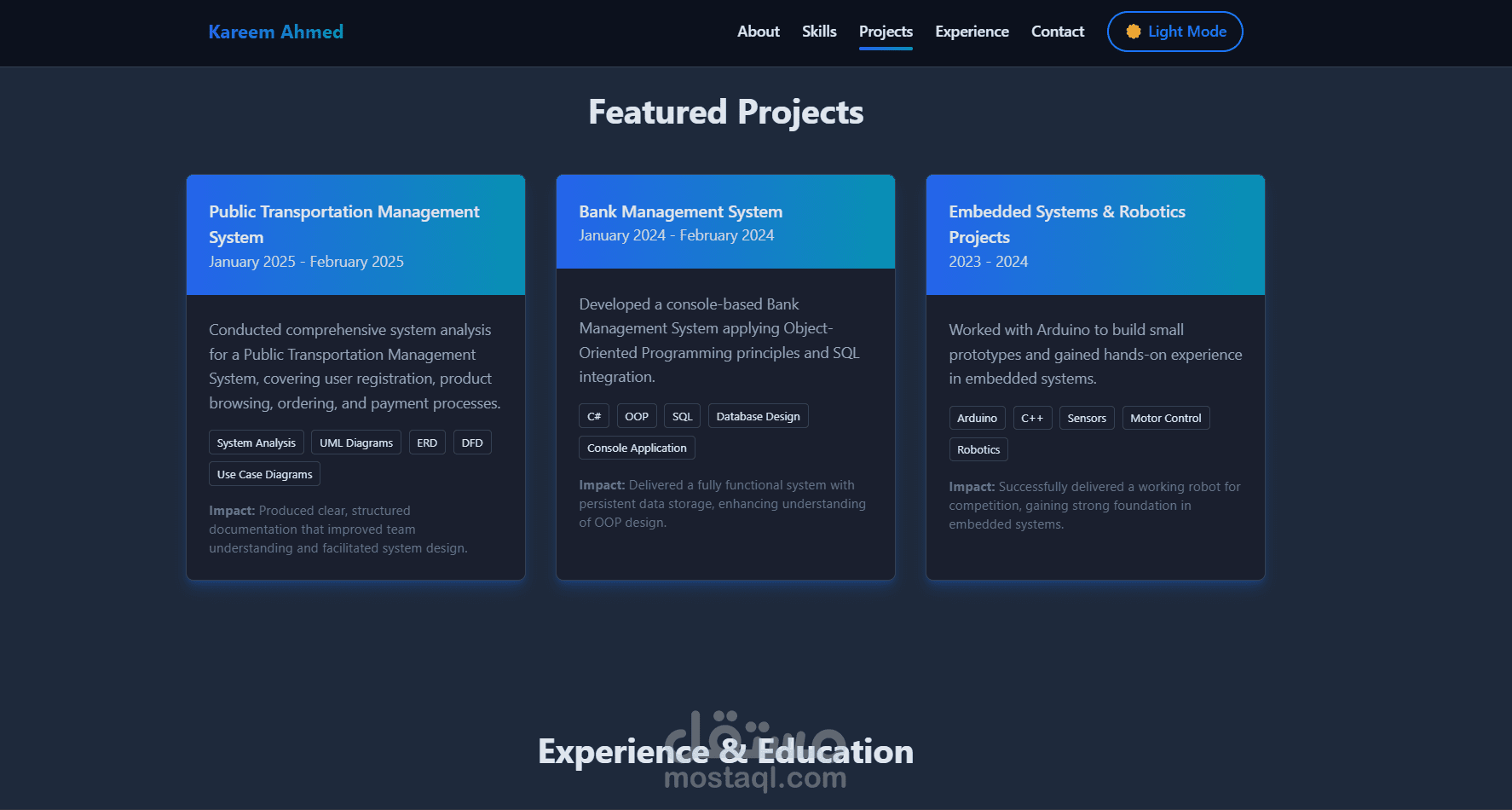 يُبرز الموقع شغفًا بتطوير الواجهات الأمامية والخلفية باستخدام تقنيات مثل ASP.NET Core، React، وSQL Server، مع تركيز على الأداء، القابلية للتوسّع، وتجربة المستخدم السلسة.