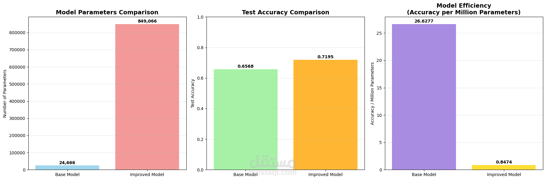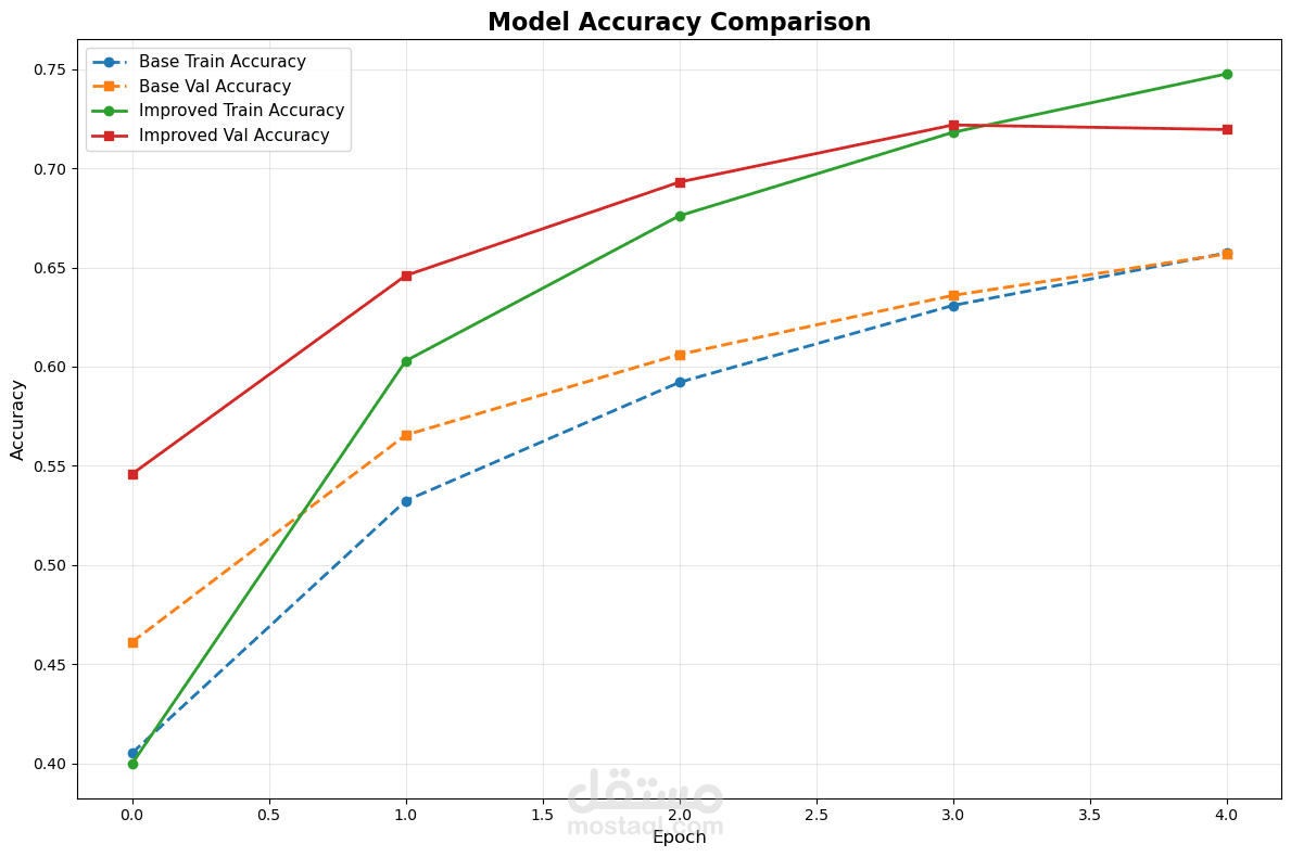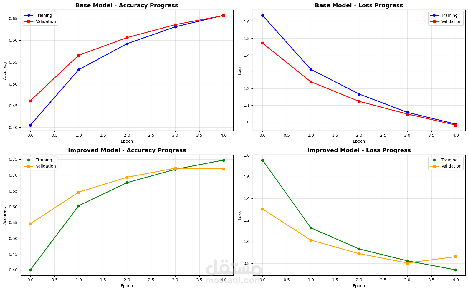 تم تحسين النموذج بإضافة طبقات أكثر عمقًا مثل Dropout وBatch Normalization، بالإضافة إلى ضبط معاملات التعلم لتحسين الأداء وتقليل التعميم الزائد (Overfitting).