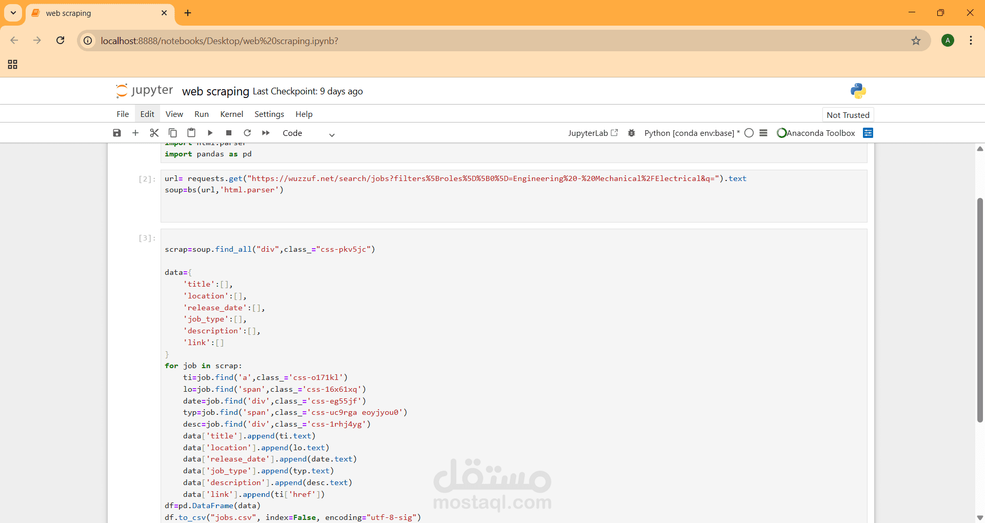 يقوم السكربت بالتنقل في صفحة البحث الخاصة بوظائف الهندسة على Wuzzuf، ويجمع معلومات مهمة عن كل وظيفة، مثل: