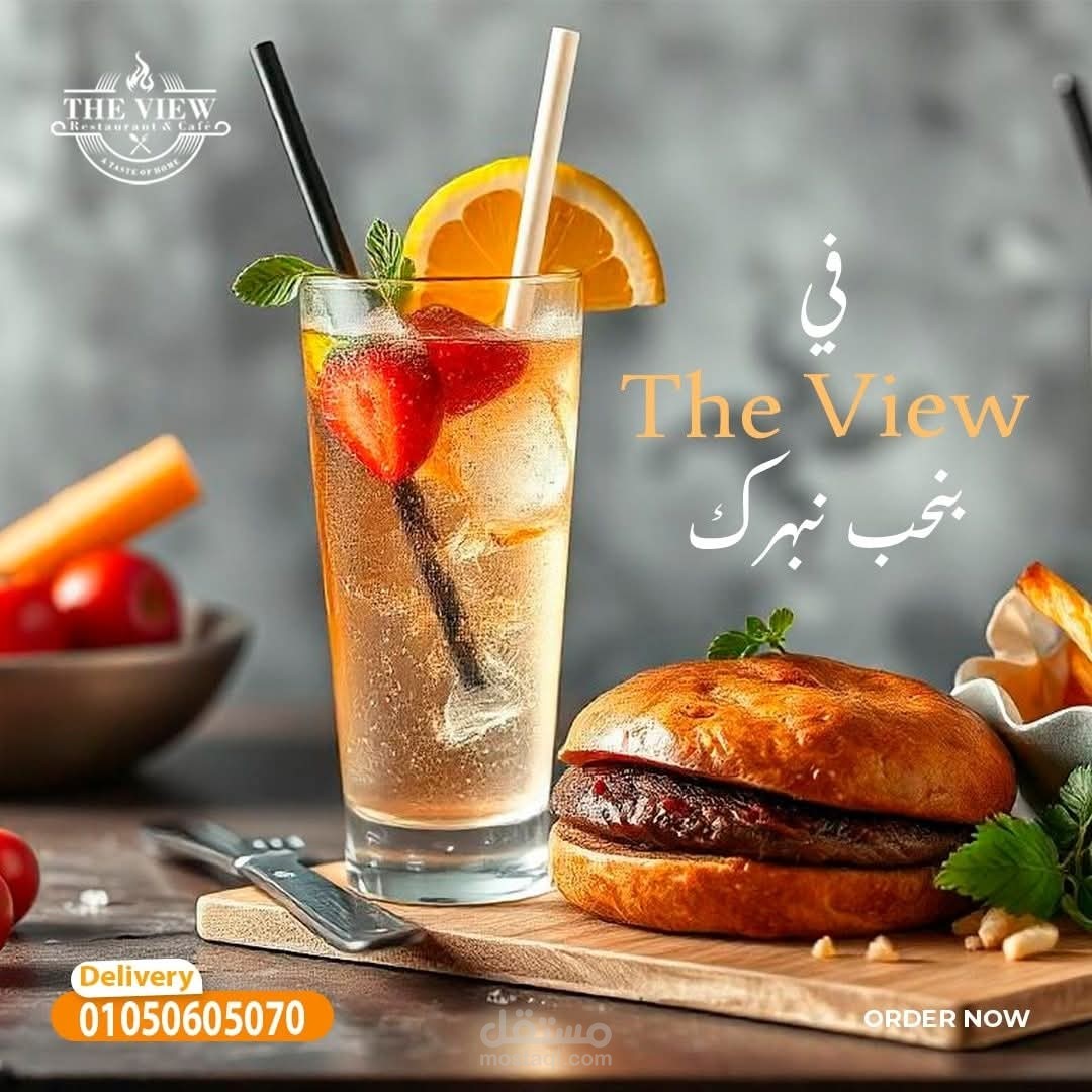 تصميم إعلاني جذاب يروّج لوجبة مشاوي بلدي مقدّمة من مطعم The View Restaurant & Café.