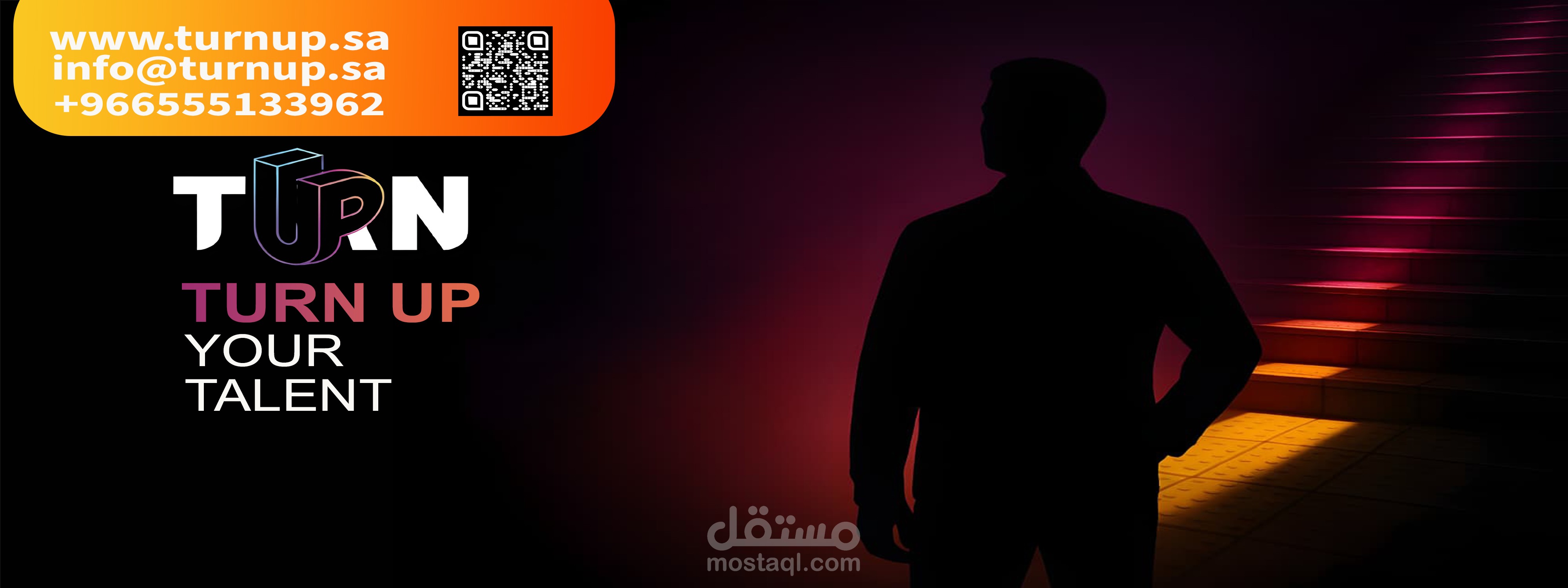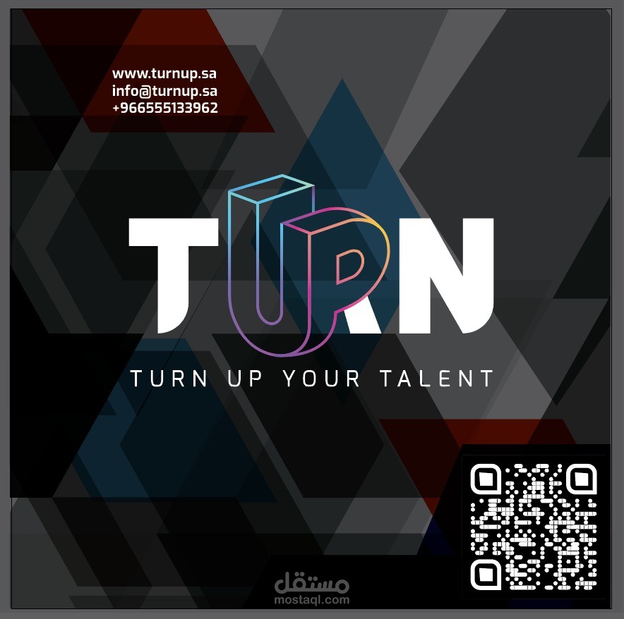 يُظهر التصميم نموذجًا ثلاثي الأبعاد لجناح عرض (Booth) احترافي مخصص للفعاليات والمعارض، يحمل شعار “TURN UP YOUR TALENT” مع خلفية فنية توحي بالصعود والتطور.