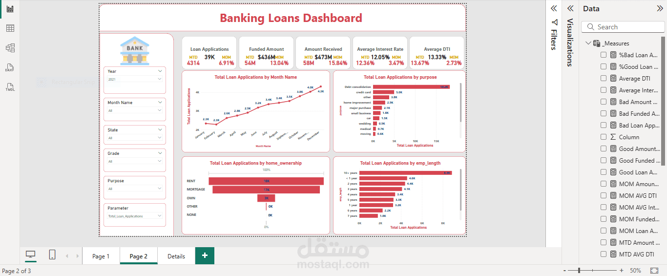 الميزات الرئيسية للعمل (Key Features): 1. تتبع الأداء الشهري (MoM): مقارنات شهر بشهر (MoM) للمؤشرات المالية الرئيسية (المبالغ المموّلة، المبالغ المستلَمة، متوسط سعر الفائدة، ومتوسط DTI).
