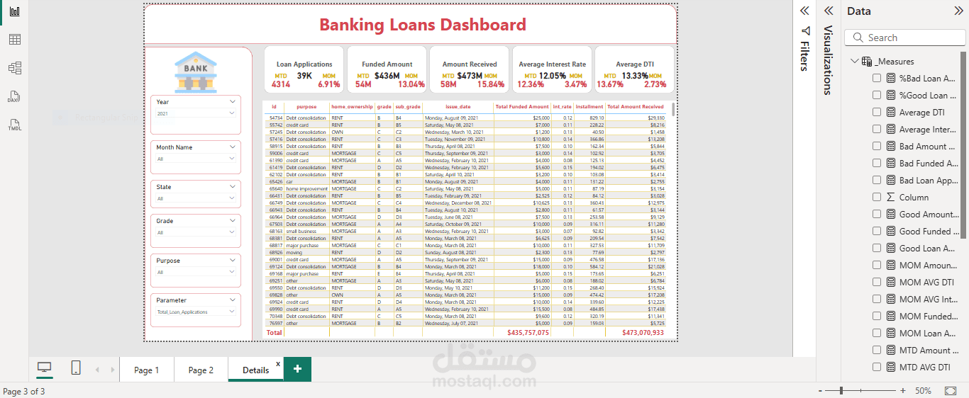 2. DAX Measures: إنشاء مقاييس معقدة لتتبع المقارنات الشهرية (MoM) وحساب نسب التعثر والمبالغ المموّلة.