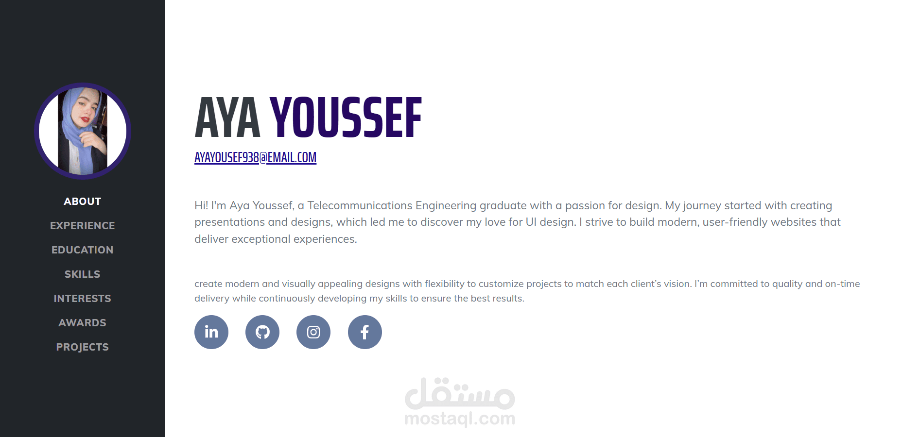 صممت بورتفوليو خاص بي بسيط يعرض أعمالي ومهاراتي بطريقة نظيفة وسهلة التصفح. البورتفوليو متجاوب ويعمل على الكمبيوتر والموبايل، مع أقسام واضحة: نبذة عني ، المهارات، الأعمال السابقة، وطرق التواصل.