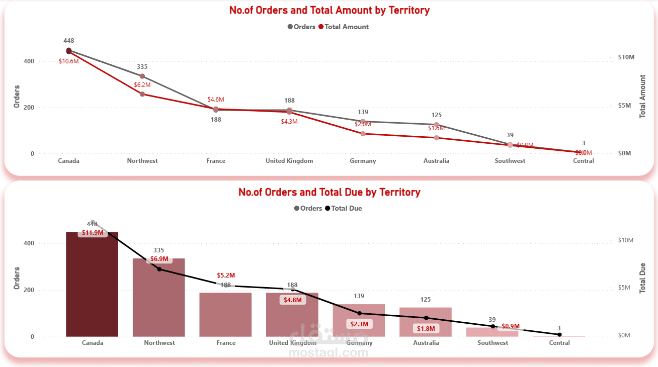-Canada is leading with over $10.6M in total amount and the highest number of orders.