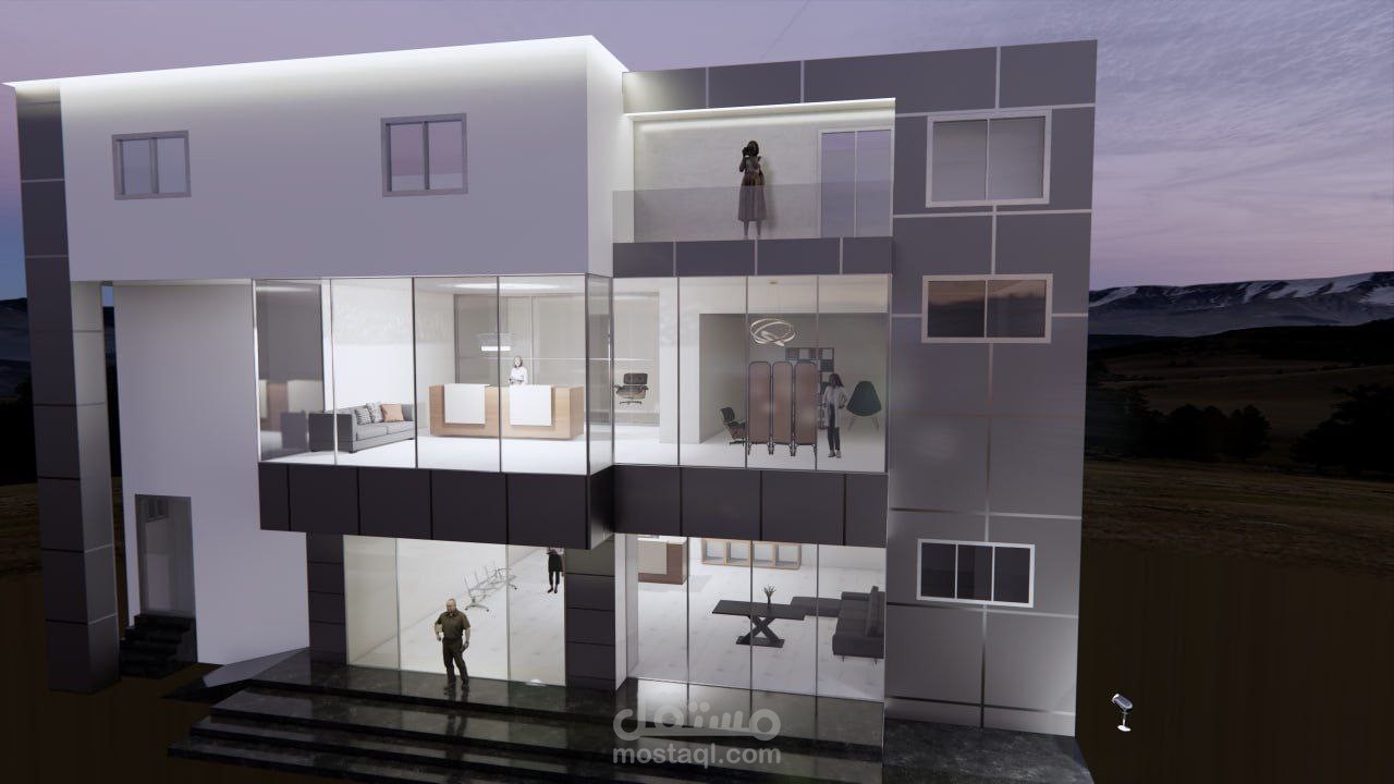 4. توحيد التكوين العام للكتلة المعمارية من خلال توزيع متوازن للنوافذ والفتحات الزجاجية بما يتناسب مع الفعاليات الداخلية (غرف المعالجة والاستقبال).
