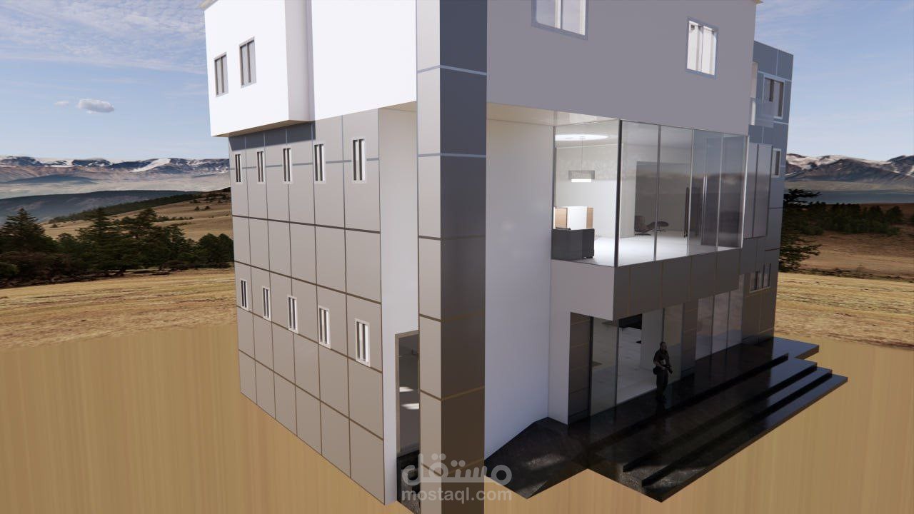 1. إكساء الواجهات بألواح الألكوبوند (Alucobond) وفقًا لرغبة العميل، بتدرجات رمادية أنيقة تمنح المبنى مظهرًا عصريًا متجانسًا ومقاومًا للعوامل الجوية.
