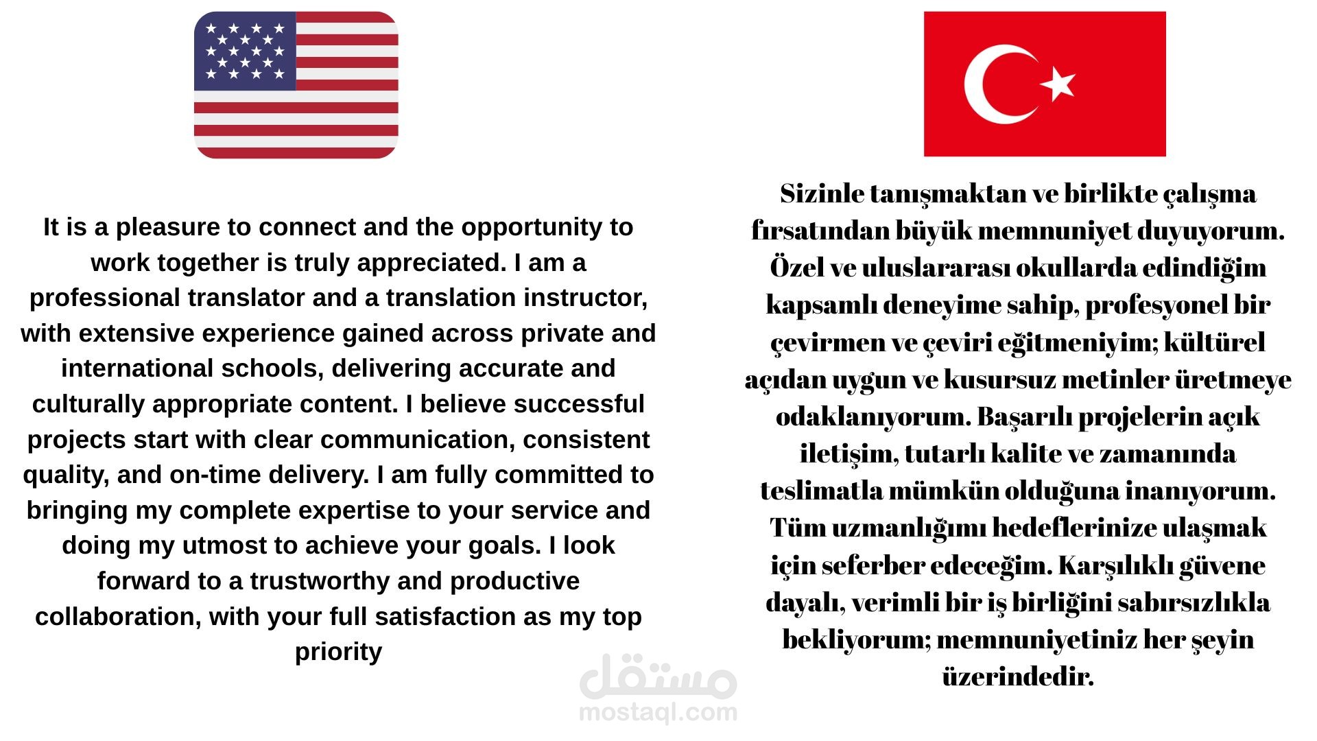 ترجمة احترافية دقيقة من العربية إلى الإنجليزية، والفرنسية، والألمانية، والإيطالية، والتركية، ومن هذه اللغات إلى العربية، مع الحفاظ التام على المعنى والأسلوب والنبرة والسياق الثقافي لكل لغة. يركّز العمل على نقل المحتوى بدقة لغوية عالية وتوحيد المصطلحات المتخصصة، مع مراجعة لغوية نهائية تضمن خلو النص من الأخطاء الإملائية والنحوية وعلامات الترقيم وتناسق الصياغة عبر كامل المستند. تُنفَّذ الترجمة بأسلوب طبيعي يجعل النص الهدف يبدو وكأنه كُتب بلغته الأصلية، مع الالتزام بالفروق الدلالية والاصطلاحية بين اللغات، والحفاظ على الأرقام والأسماء والكيانات كما وردت عند الاقتضاء. يشمل ذلك ضبط تنسيقات النصوص والجداول والعناوين والعناصر المرجعية إن وُجدت، وصولاً إلى نسخة نهائية مصقولة وجاهزة للنشر، تعكس أعلى معايير الدقة والاحترافية في الاتجاهين بين العربية وكل من الإنجليزية والفرنسية والألمانية والإيطالية والتركية.