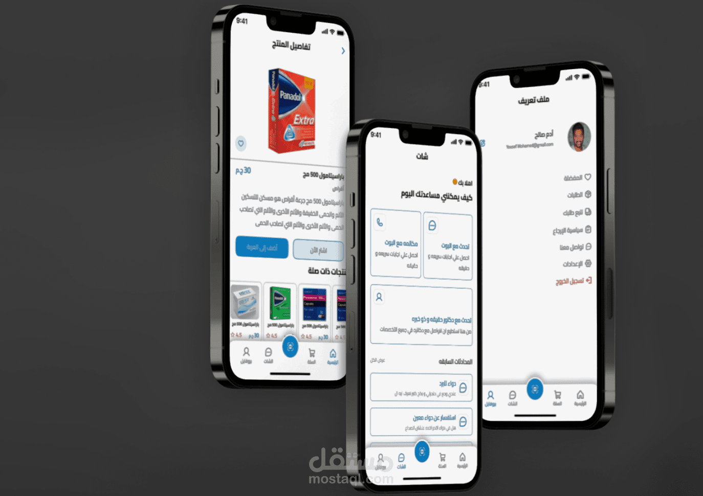 يشمل التطبيق ميزات أساسية مثل البحث عن الأدوية، رفع الروشتات، تحديد أقرب صيدلية، وواجهة شراء مبسطة.