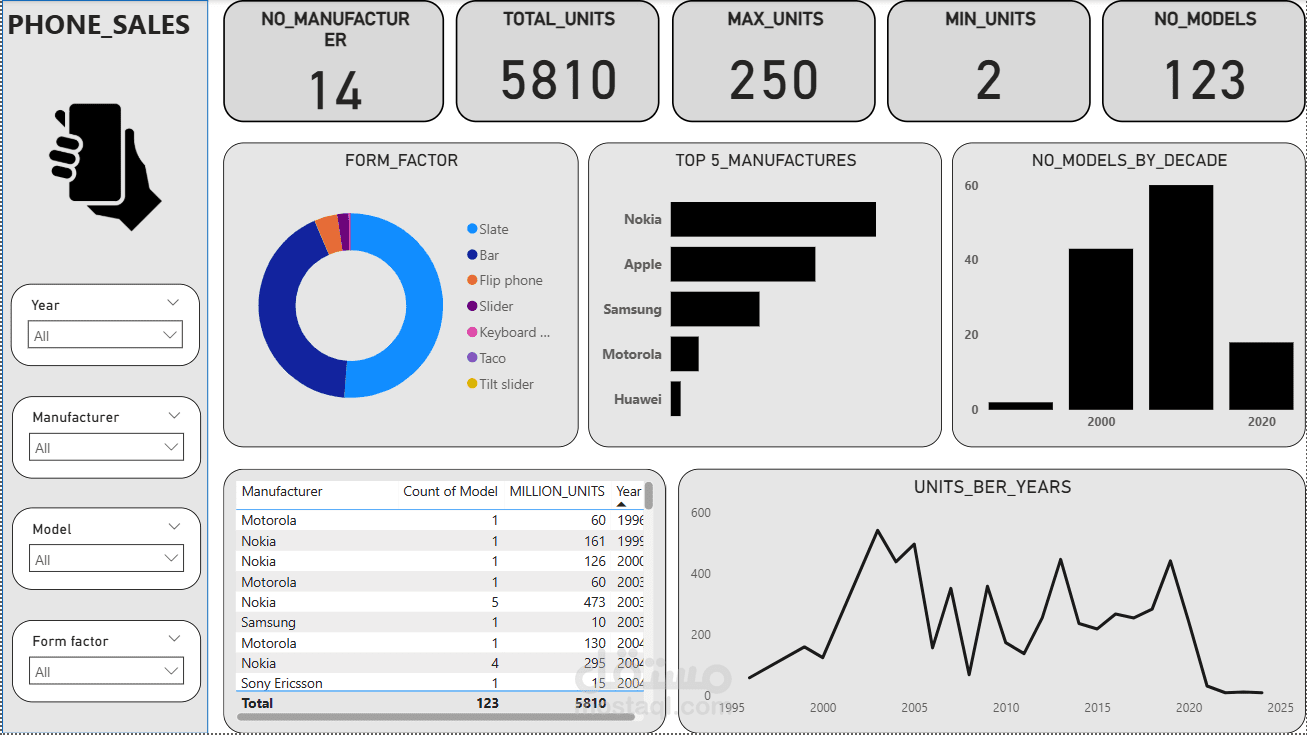 أقدم تصميم Phone Sales Dashboard احترافية باستخدام Excel أو Power BI لعرض وتحليل بيانات مبيعات الهواتف عبر السنوات بطريقة تفاعلية وسهلة الفهم، زي النموذج اللي باين في الصور المرفقة.