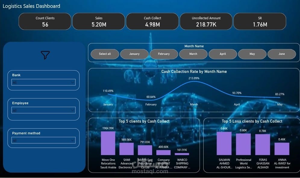 تصميم وتطوير لوحة تحكم تفاعلية (Interactive Dashboard) باستخدام أدوات تحليل البيانات المتقدمة، لعرض ومراقبة مؤشرات الأداء الرئيسية (KPIs) لشركة تعمل في مجال الخدمات اللوجستية.