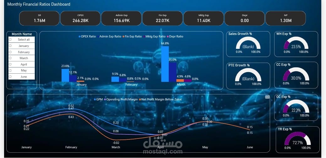 عرض النسب المالية الشهرية (المصاريف التشغيلية، الإدارية، التسويقية، إلخ) ومعدلات الربح والخسارة.
