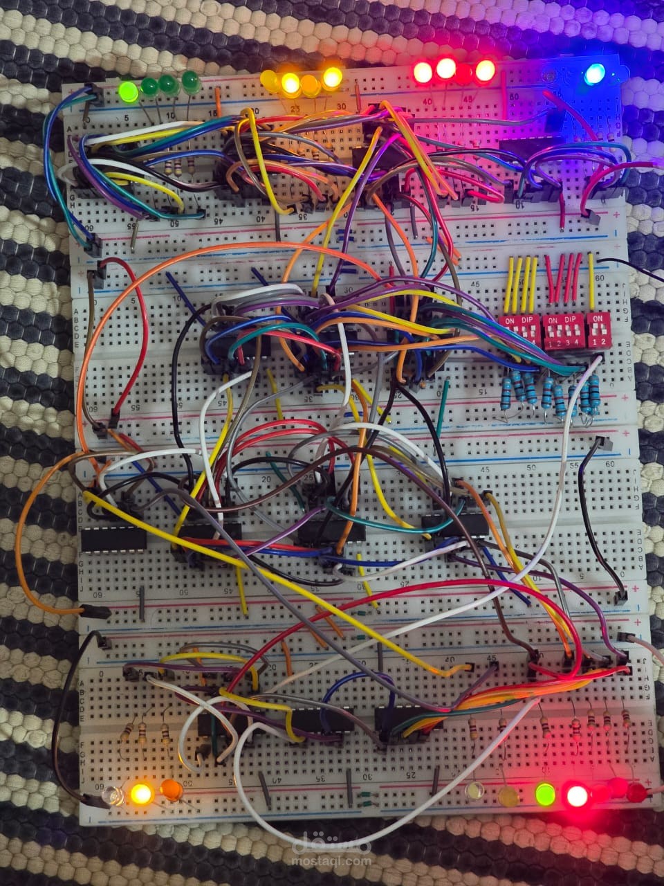 -المشروع عبارة عن دائرة حسابية ومنطقية 4-بت (4-bit Arithmetic & Logic Unit) تم تصميمها باستخدام البوابات المنطقية الأساسية (AND – OR – XOR – NOT) لتنفيذ عمليتين رئيسيتين: الجمع (Addition) والمقارنة (Comparison) بين رقمين ثنائيين مكونين من 4 بت، يُمثَّلان بالمدخلين A (A3–A0) و B (B3–B0).