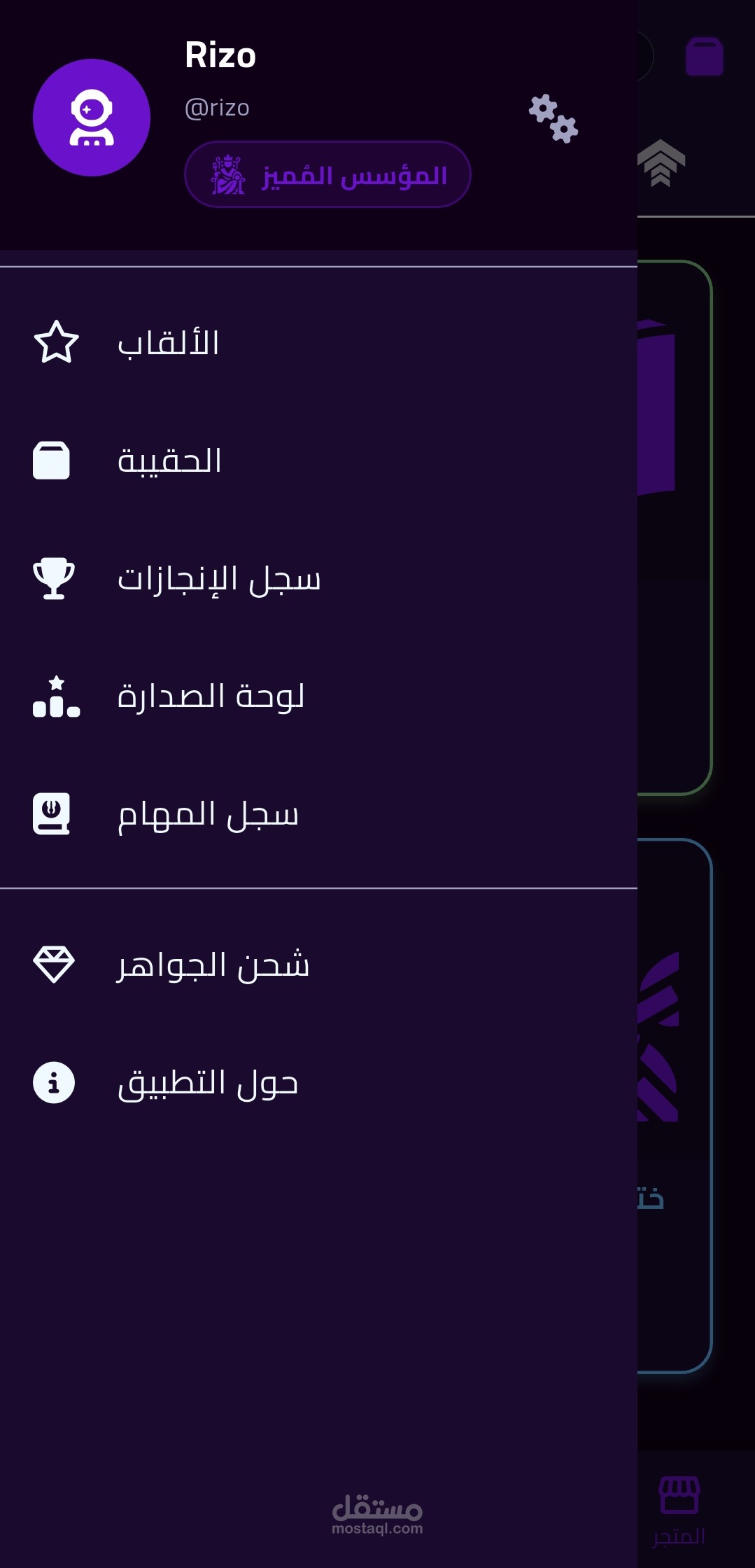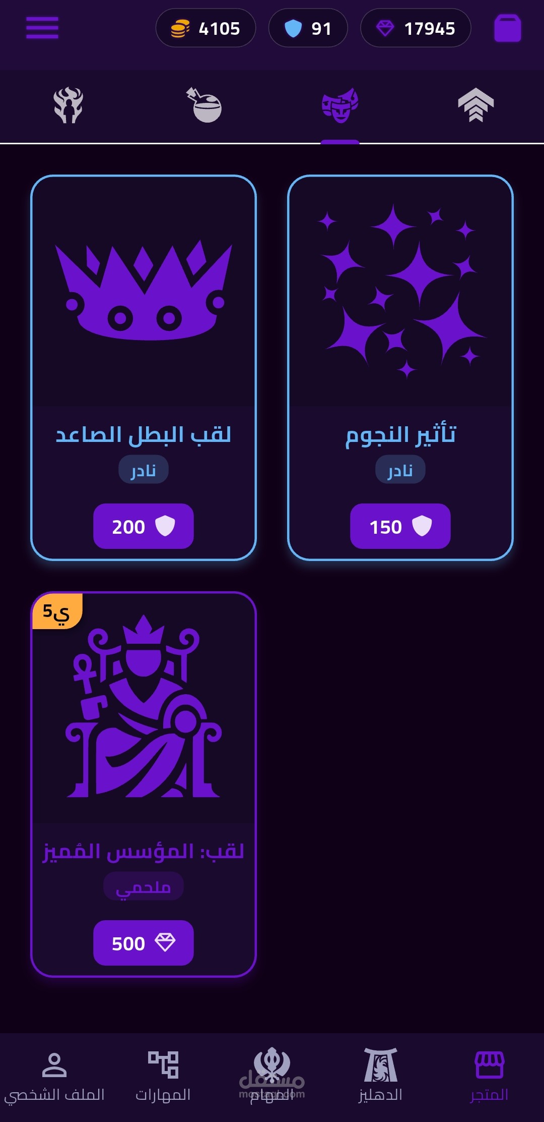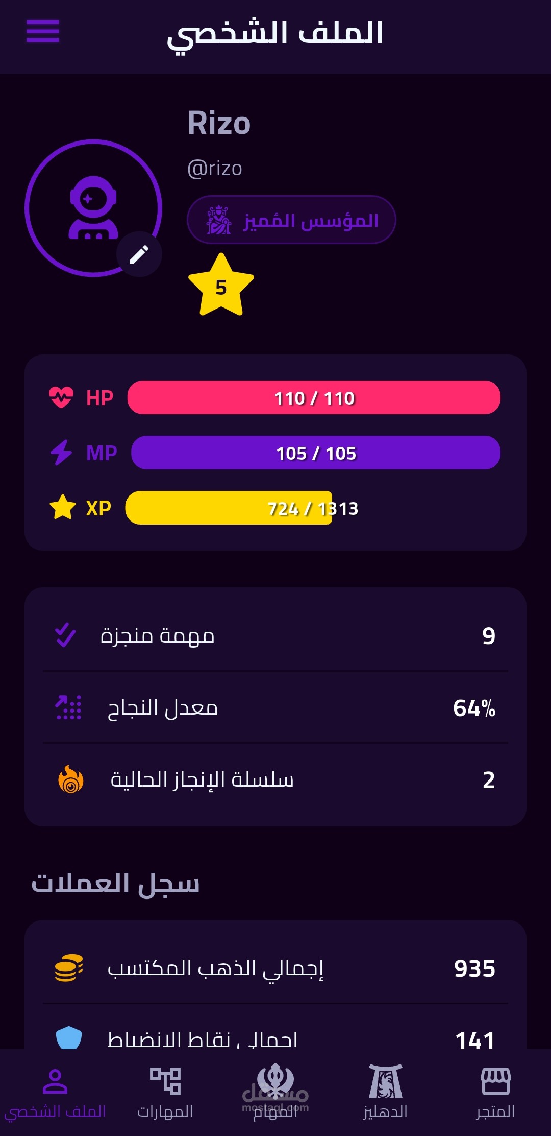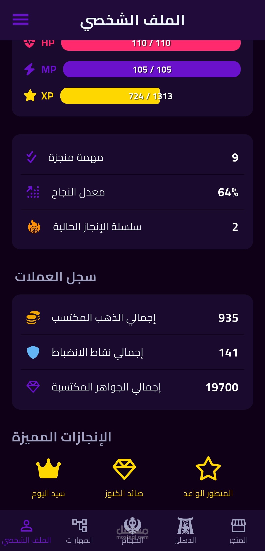 الملف الشخصي لعرض الالقاب والانجازات والمستوي والاسم والاحصائيات والافاتار