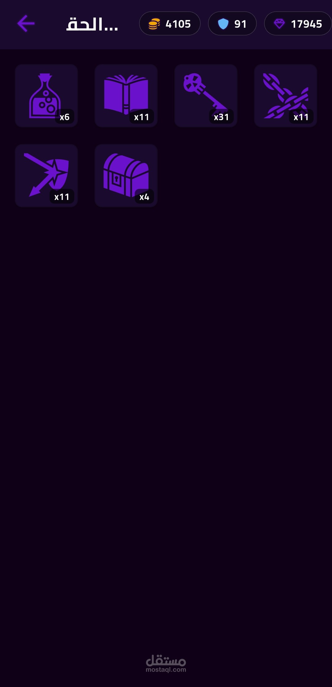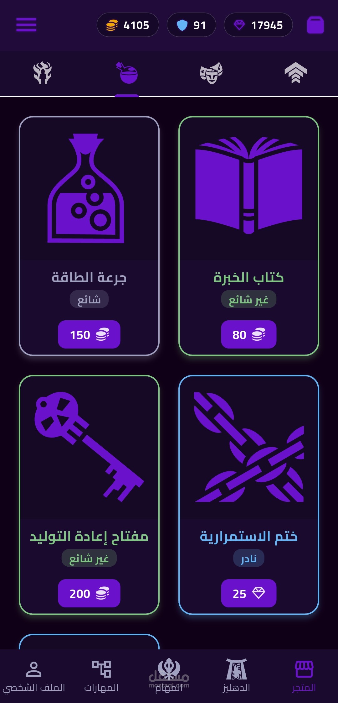 متجر وحقيبة عناصر لاستخدام الموارد المكتسبة وتطوير الشخصية.