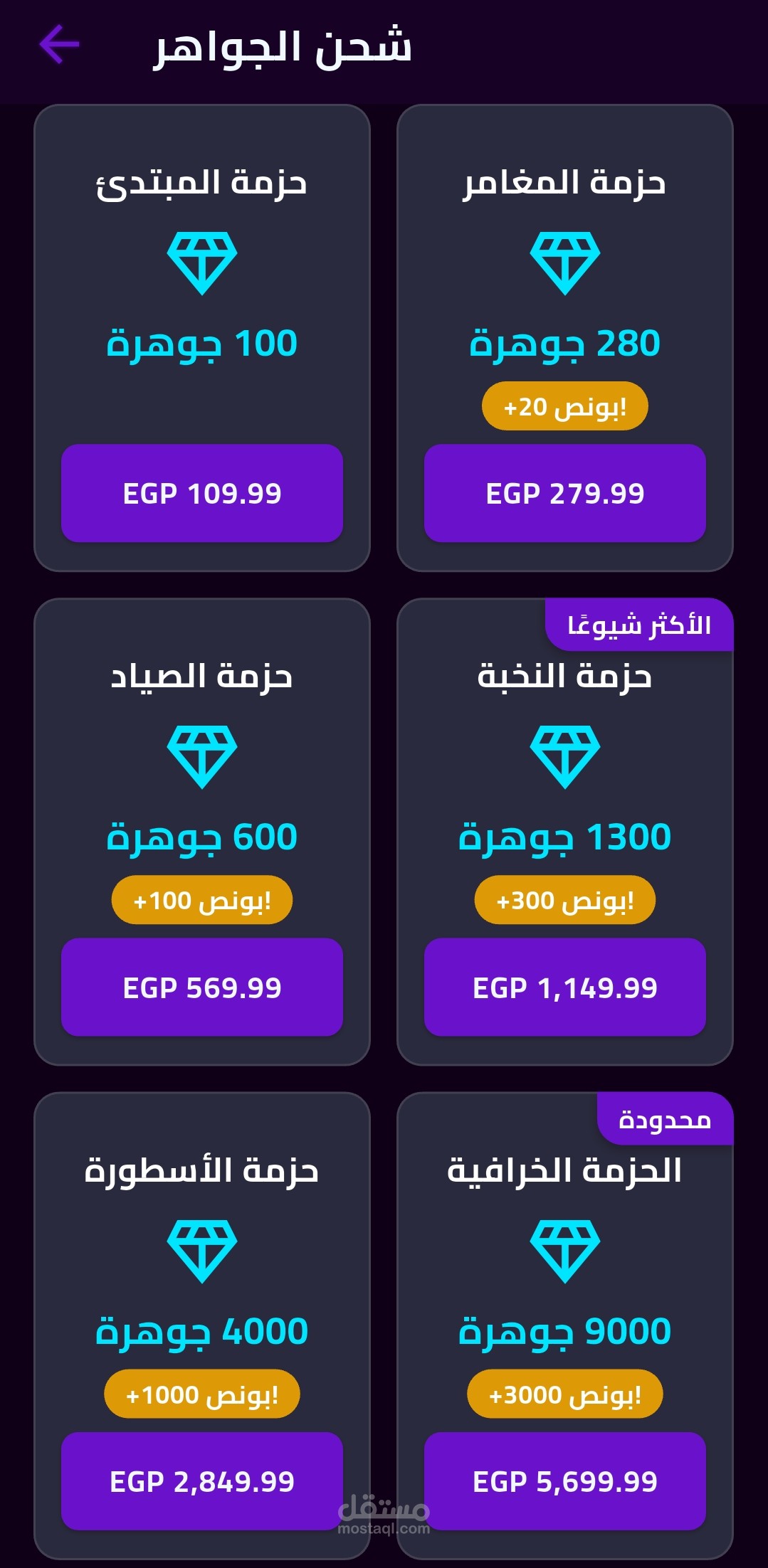 صفحة شراء الجواهر: شاشة لشراء الجواهر من خلال متجر بلاي
