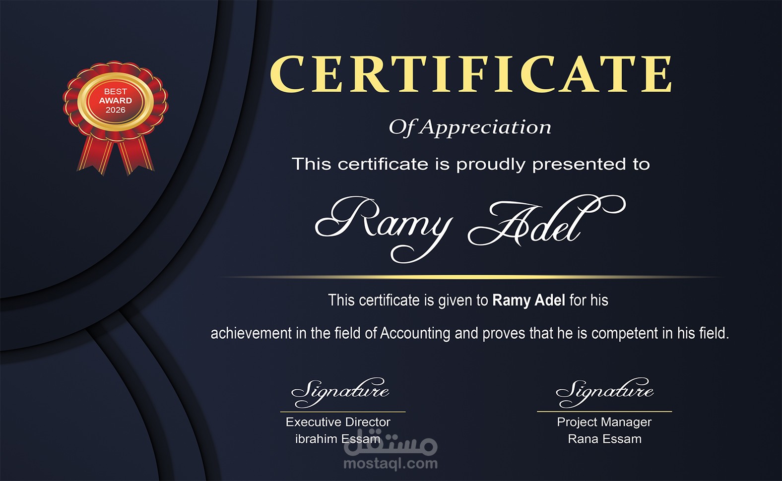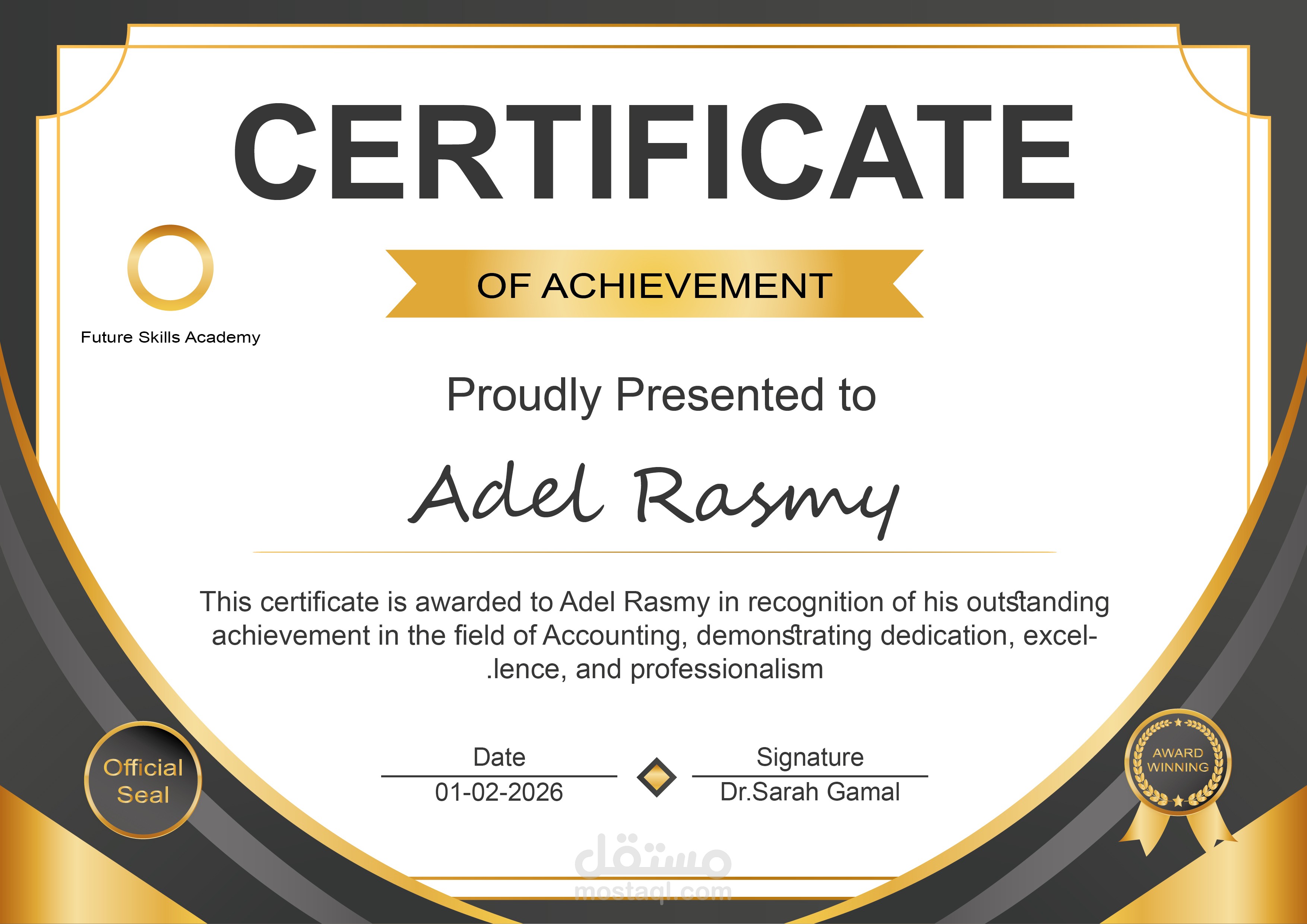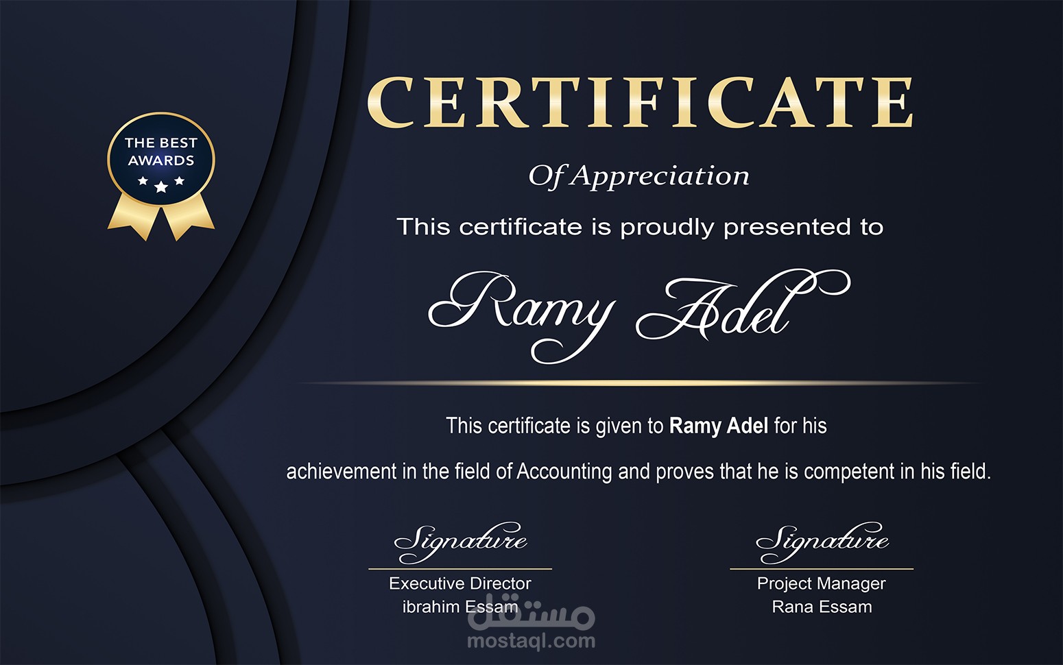 تصميم شهادات جاهزة للطباعة والاستخدام الرقمي، مع مراعاة مقاسات A4 الرسمية وأبعاد مختلفة حسب الحاجة.
