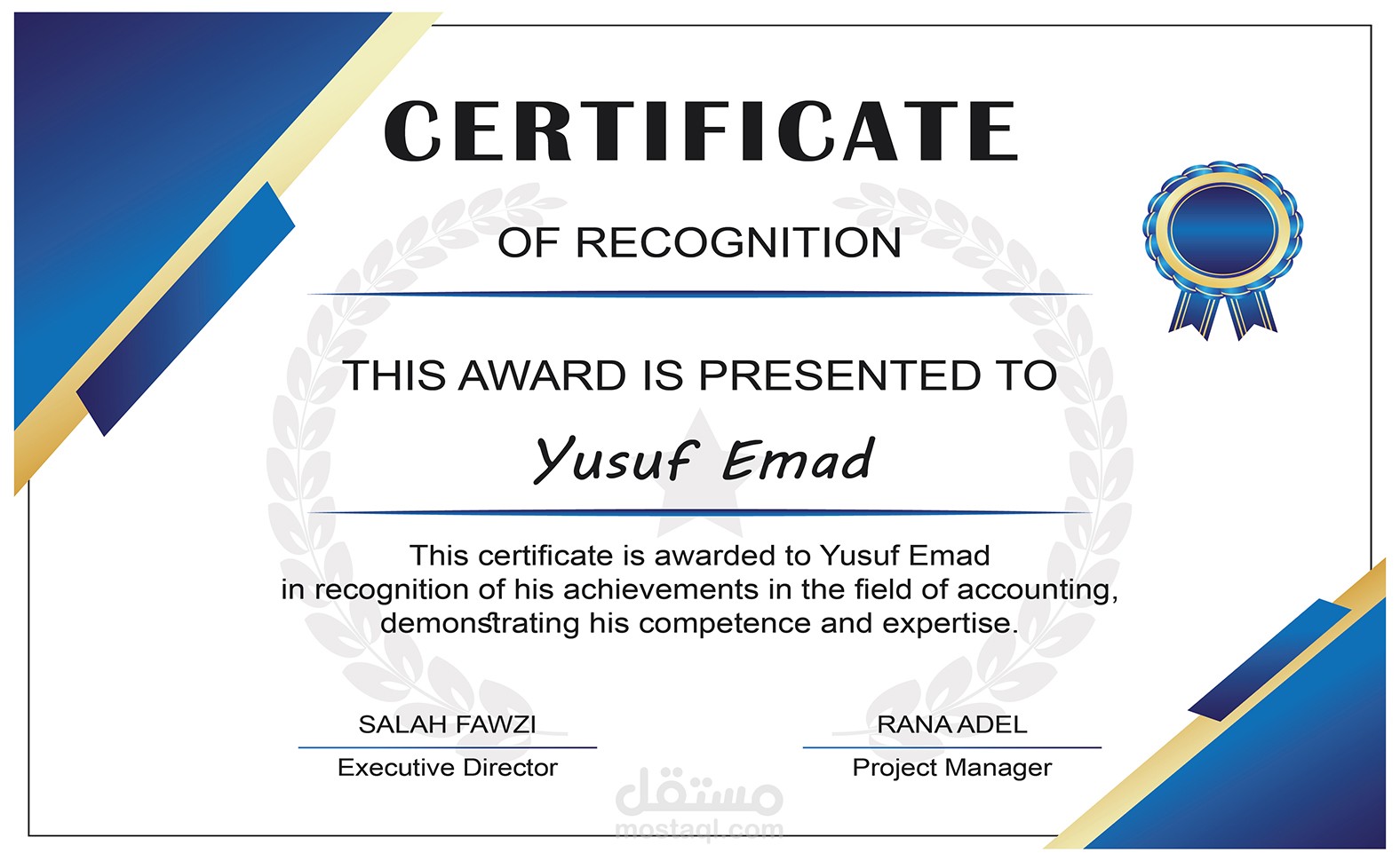 استخدام عناصر زخرفية راقية مثل الإطارات، الشعارات، والأيقونات الرمزية لتعزيز الطابع الرسمي والاحترافي للشهادة.