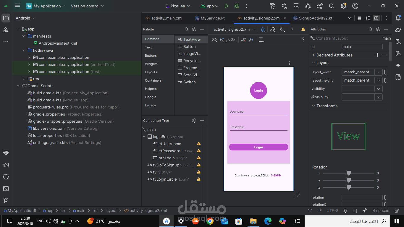 أنا أعمل حالياً على تطوير تطبيق أندرويد باستخدام Android Studio ولغة Kotlin. في الوقت الحالي، أقوم بتصميم وتنفيذ واجهة المستخدم لشاشة تسجيل الدخول/إنشاء حساب. أنا أعمل على ضبط تنسيق العناصر وتحديد خصائصها بدقة لضمان تصميم جذاب وسهل الاستخدام (UI/UX) وظيفي.