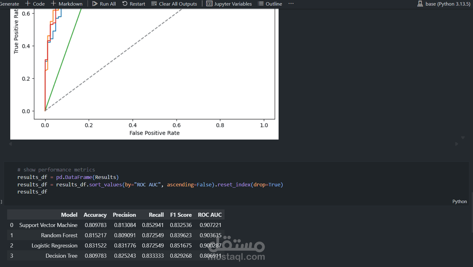 تدريب نماذج متعددة مثل Logistic Regression، Random Forest، SVM ومقارنة أدائها لاختيار النموذج الأفضل.