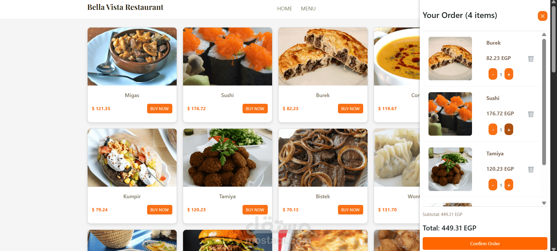 المستخدم كمان يقدر يزوّد أو يقلّل الكمية لكل صنف، والسعر الإجمالي بيتحدث تلقائيًا في الوقت الفعلي
