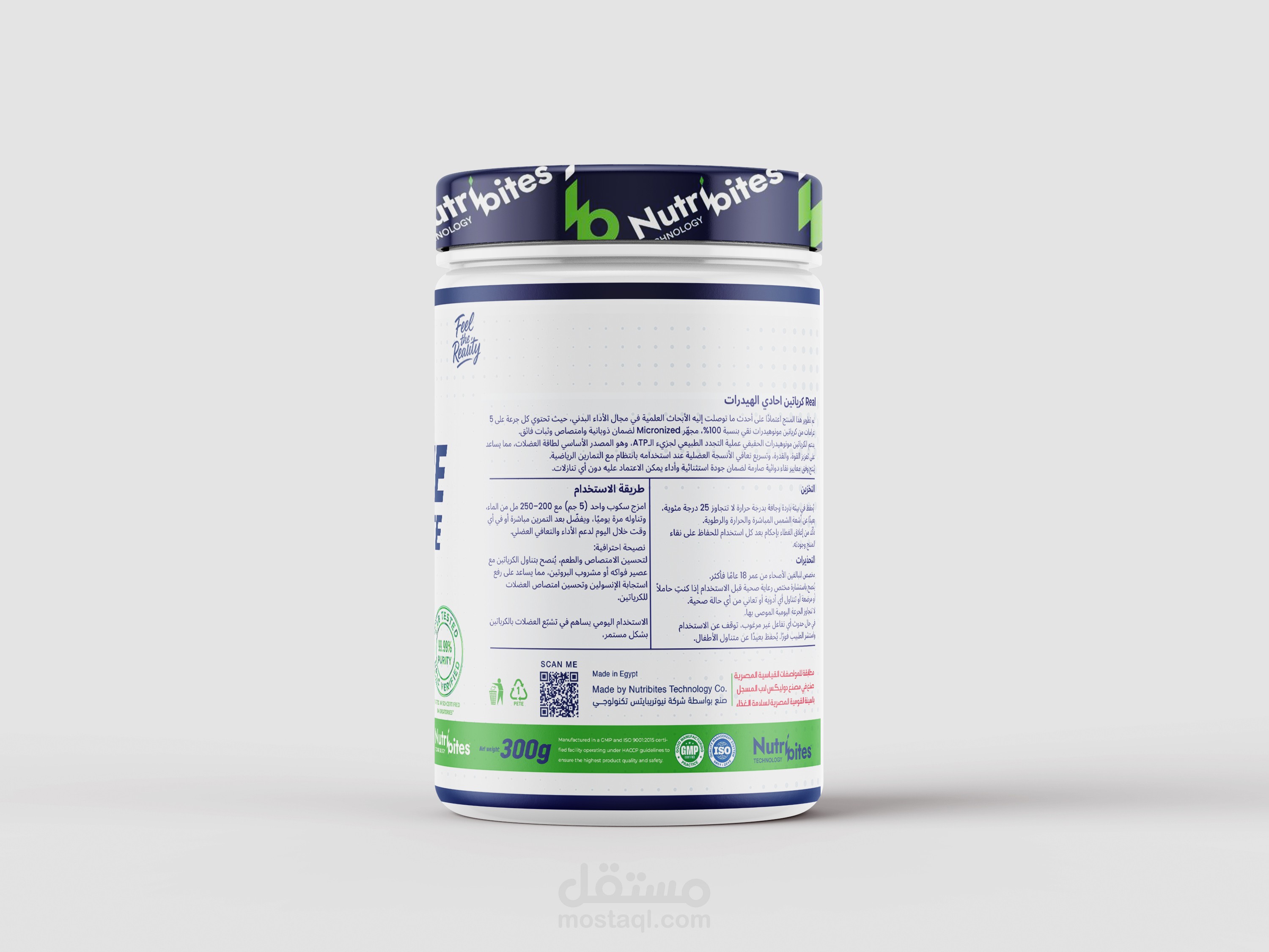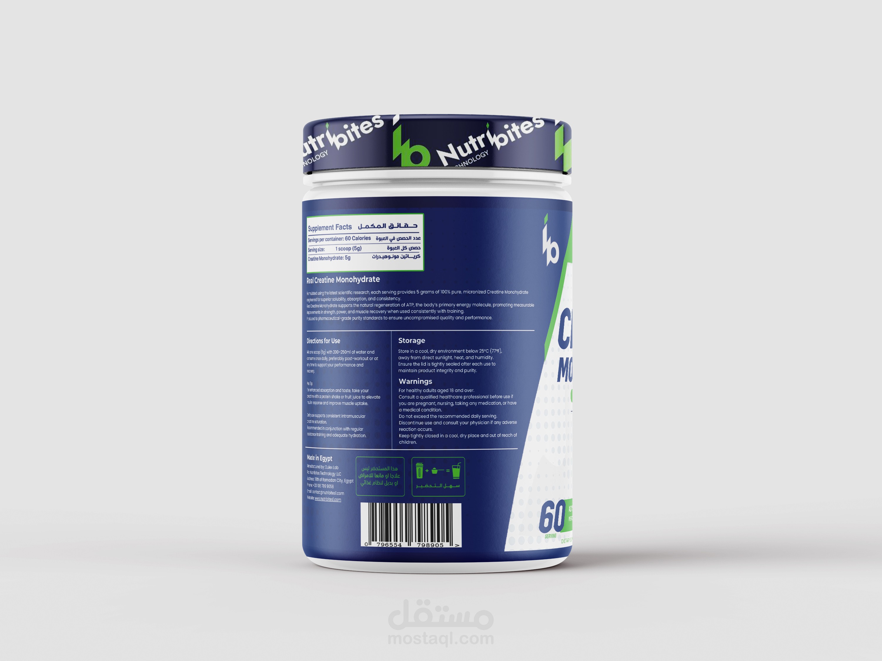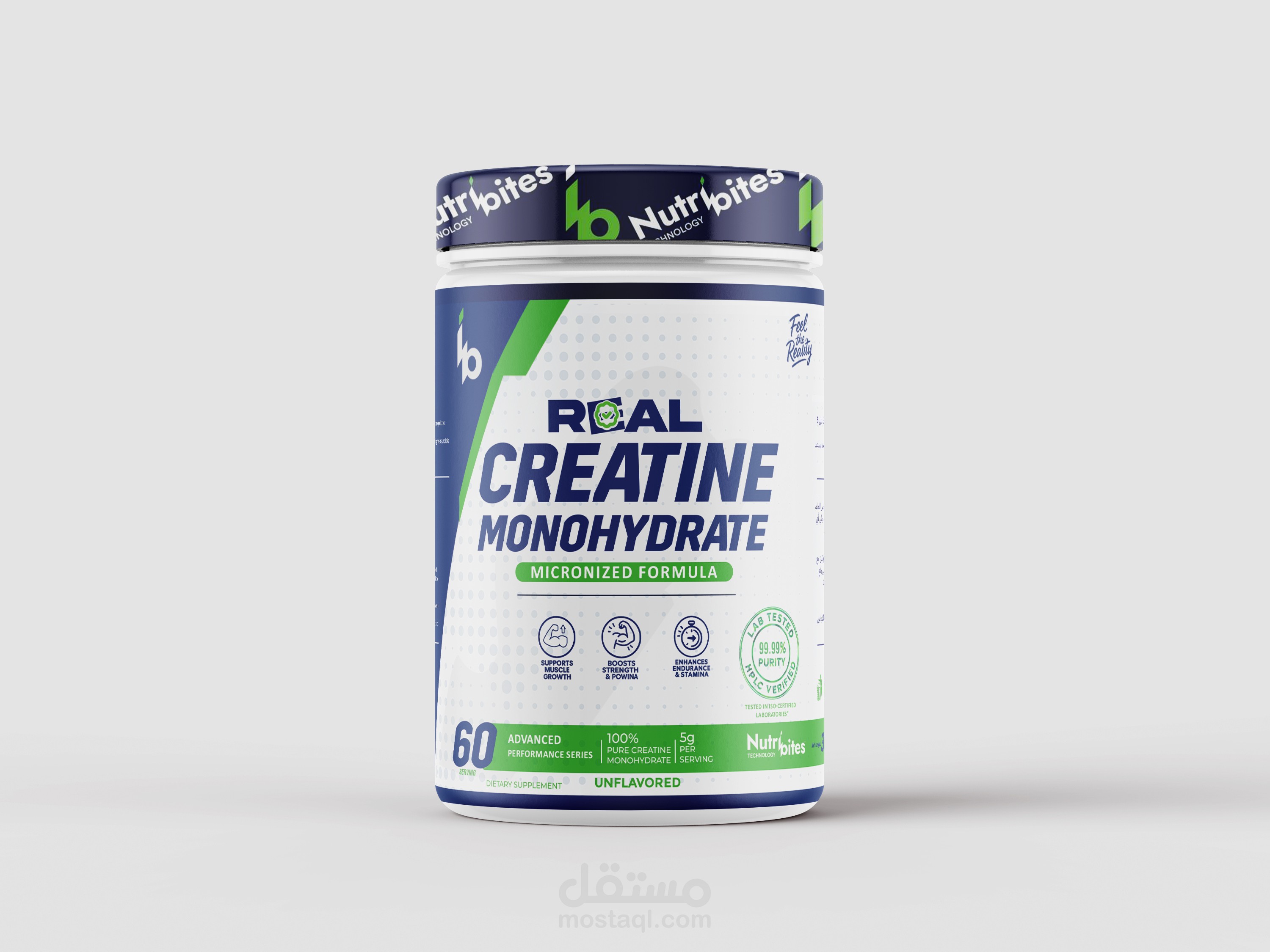 تصميم عبوة وستيكر كرياتين مع اظهار اقوي مميزات المنتج بشكل احترافي وجذاب