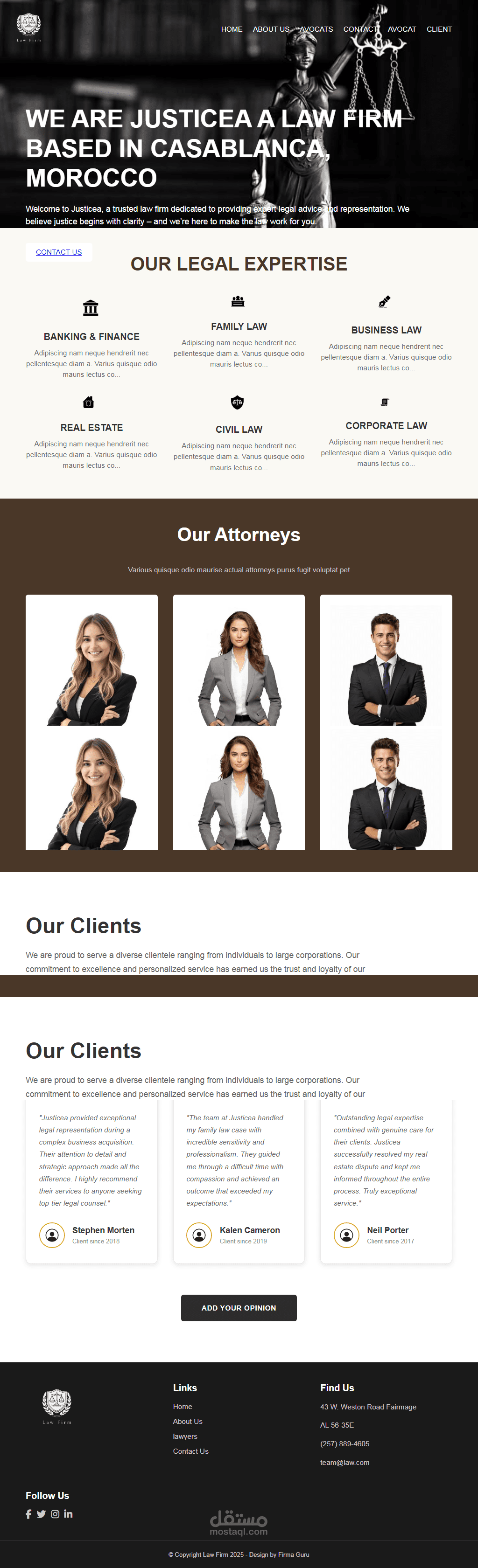 موقع ديناميكي خاص بمكتب محاماة بمدينة الدار البيضاء، يعرّف بالخدمات القانونية وفريق المحامين.