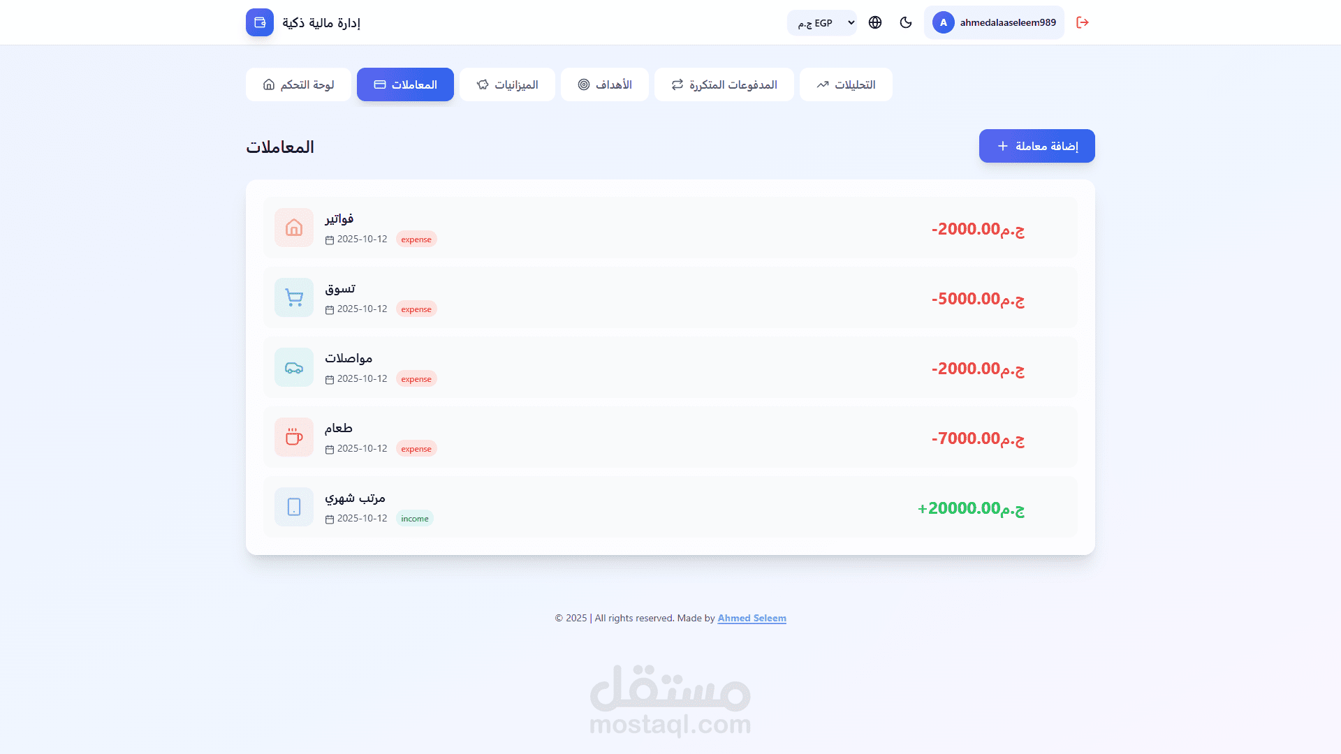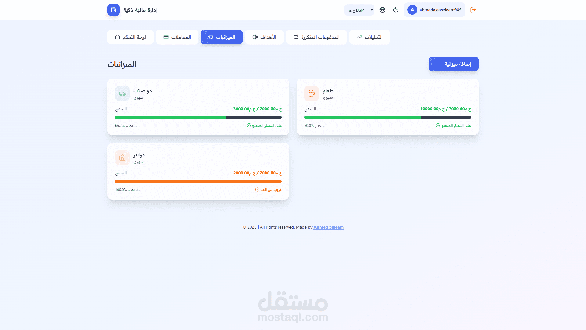 منصة ويب حديثة لإدارة الشؤون المالية الشخصية، تساعد المستخدم على تتبع الدخل والمصروفات، إدارة الميزانيات، تحديد الأهداف المالية، وتحليل الإنفاق بطريقة سهلة وواضحة.