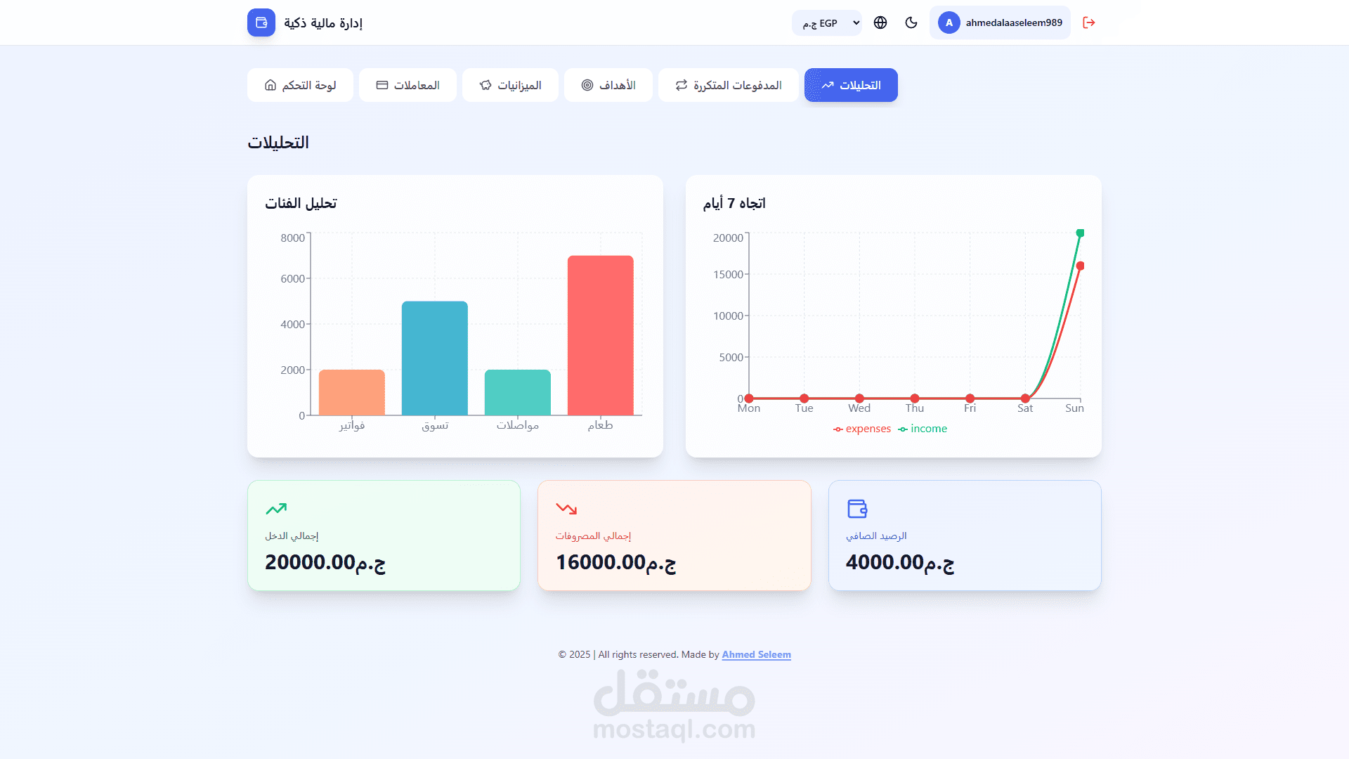 تم تطويره باستخدام React.js وChart.js لعرض التحليلات البيانية، مع تنظيم متكامل للبيانات المالية اليومية.